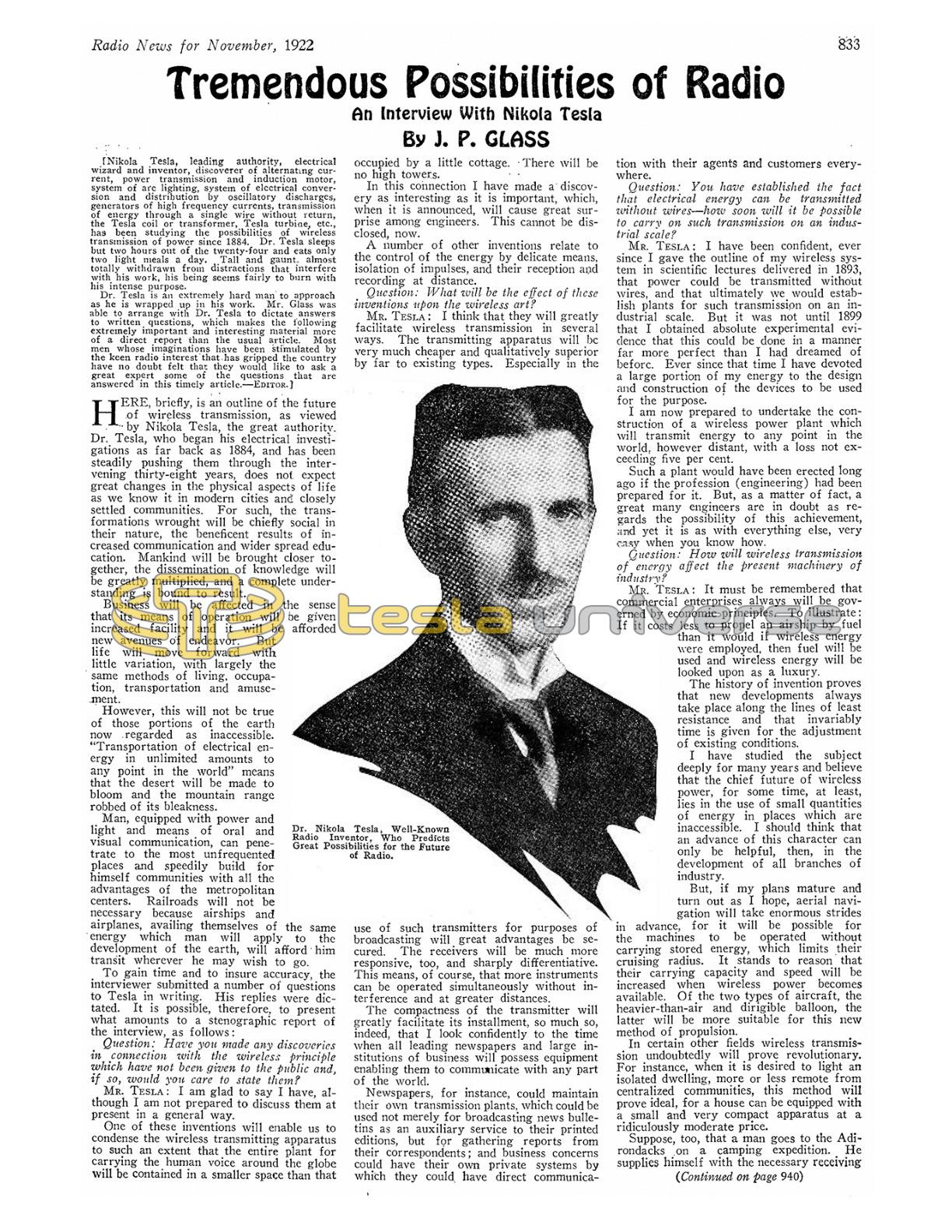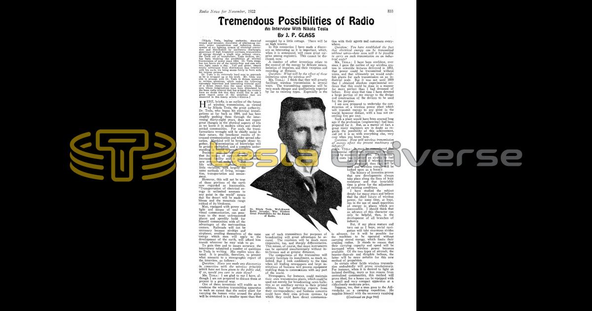 Dr. Tesla is an extremely hard man to approach as he is wrapped up in his work. Mr. Glass was able to arrange with Dr. Tesla to dictate answers to written questions, which makes the following extremely important and interesting material more of a direct report than the usual article. Most men whose imaginations have been stimulated by the keen radio interest that has gripped the country have no doubt felt that they would like to ask a great expert some of the questions that are answered in this timely article. — EDITOR.]