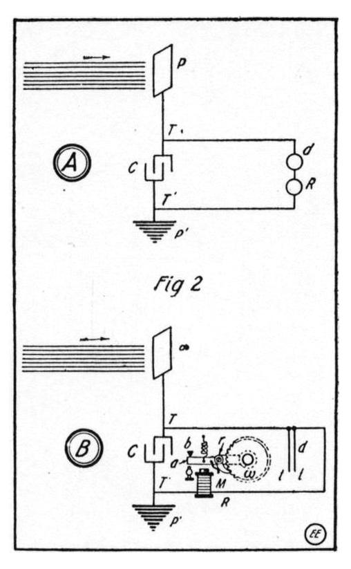 Tesla says of this matter that his own experiments and observations have led him to the conclusion that such sources of radiant energy as the sun throws off with great velocity, minute particles of matter which are strongly electrified, and are, therefore, capable of charging an electrical conductor, or, if not so, may at any rate discharge an electrified conductor either by carrying off bodily its charge or otherwise. His patents in this direction are based on alleged discovery by him that when such rays or radiations are permitted to fall upon or impinge against an insulated conducting body P connected to one terminal of a condenser, such as C in Fig. 2, while the other terminal of the condenser is made by independent means to receive or carry away electricity, a current flows into the condenser so long as the insulated body P is exposed to such rays; so that an indefinite, yet measurable, accumulation of electrical energy in the condenser takes place.