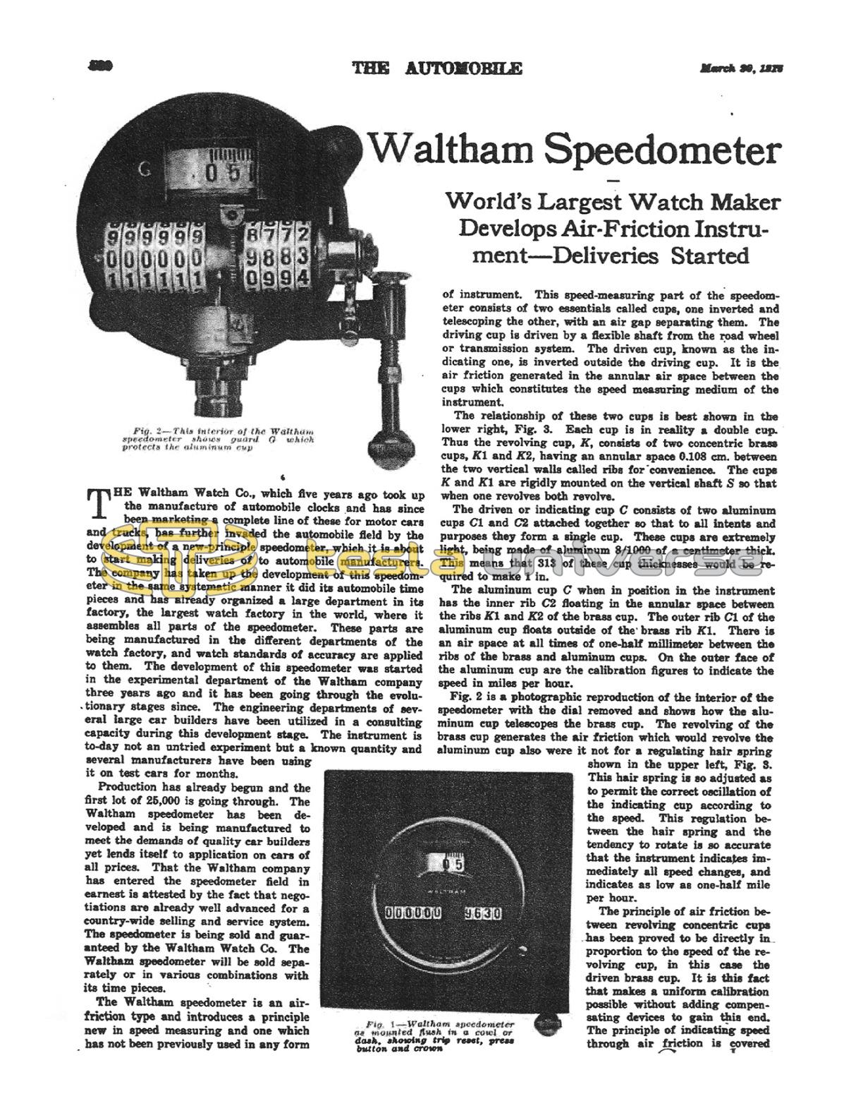 Production has already begun and the first lot of 25,000 is going through. The Waltham speedometer has been developed and is being manufactured to meet the demands of quality car builders yet lends itself to application on cars of all prices. That the Waltham company has entered the speedometer field in earnest is attested by the fact that negotiations are already well advanced for a country-wide selling and service system. The speedometer is being sold and guaranteed by the Waltham Watch Co. The Waltham speedometer will be sold separately or in various combinations with its time pieces.