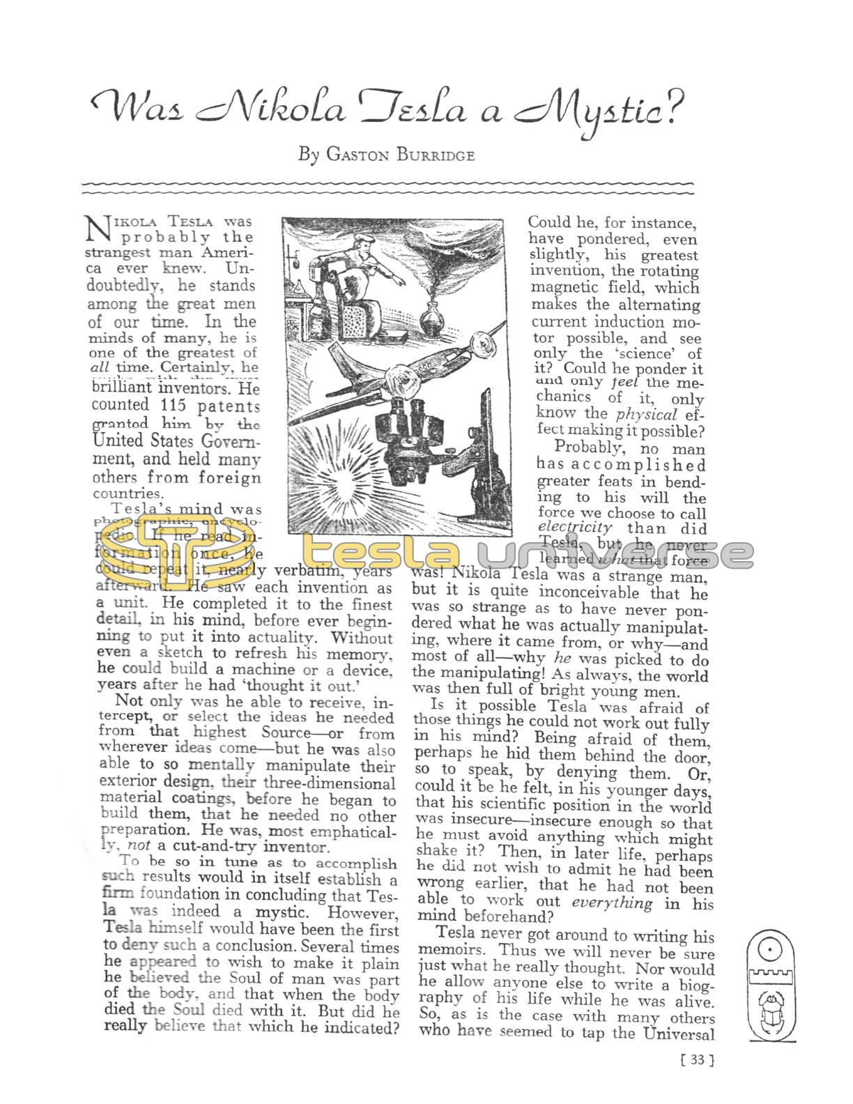 To be so in tune as to accomplish such results would in itself establish a firm foundation in concluding that Tesla was indeed a mystic. However, Tesla himself would have been the first to deny such a conclusion. Several times he appeared to wish to make it plain he believed the Soul of man was part of the body, and that when the body died the Soul died with it. But did he really believe that which he indicated?