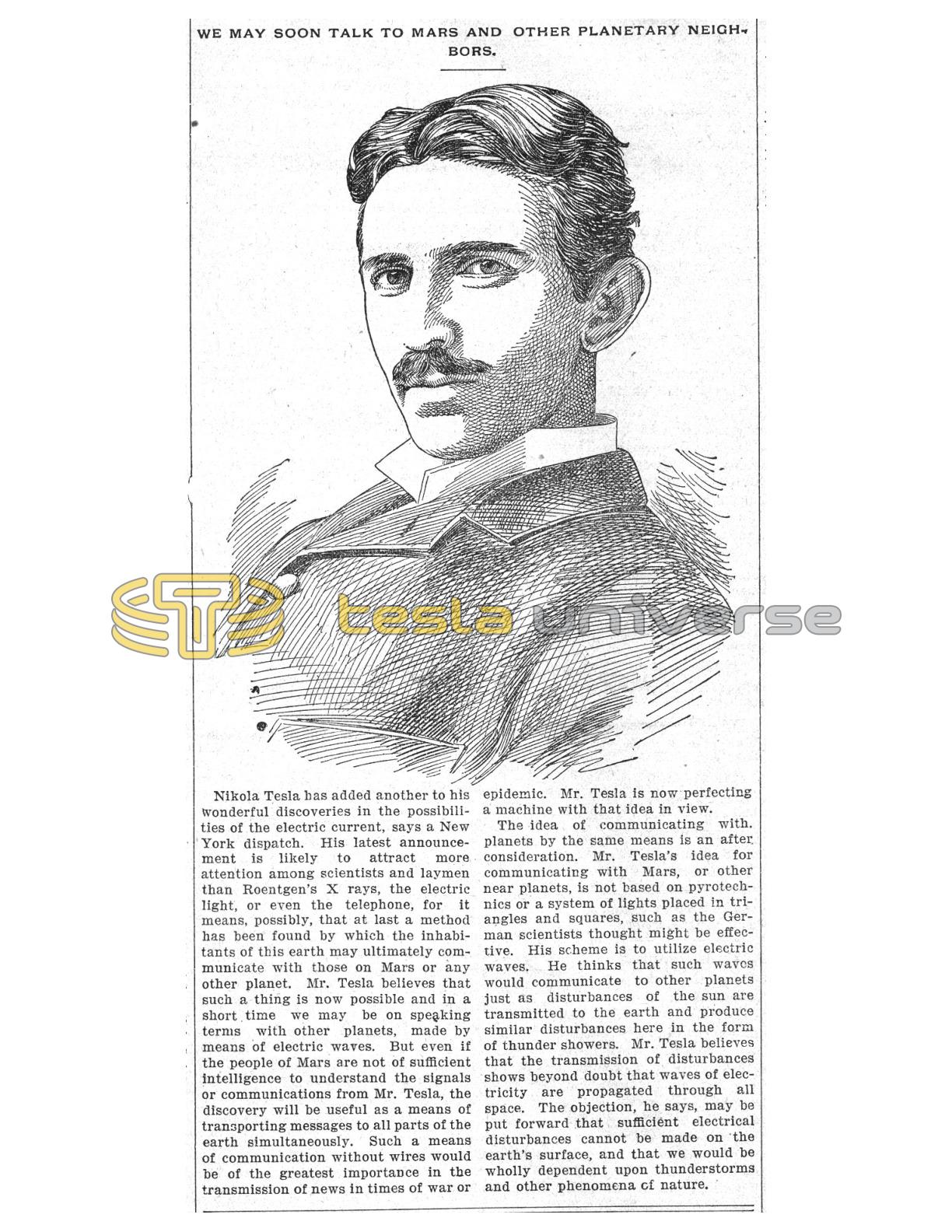 Nikola Tesla has added another to his wonderful discoveries in the possibilities of the electric current, says a New York dispatch. His latest announcement is likely to attract more attention among scientists and laymen than Roentgen’s X rays, the electric light, or even the telephone, for it means, possibly, that at last a method has been found by which the inhabitants of this earth may ultimately communicate with those on Mars or any other planet. Mr. Tesla believes that such a thing is now possible and in a short time we may be on speaking terms with other planets, made by means of electric waves. But even if the people of Mars are not of sufficient intelligence to understand the signals or communications from Mr. Tesla, the discovery will be useful as a means of transporting messages to all parts of the earth simultaneously. Such a means of communication without wires would be of the greatest importance in the transmission of news in times of war or epidemic. Mr. Tesla is now perfecting a machine with that idea in view.