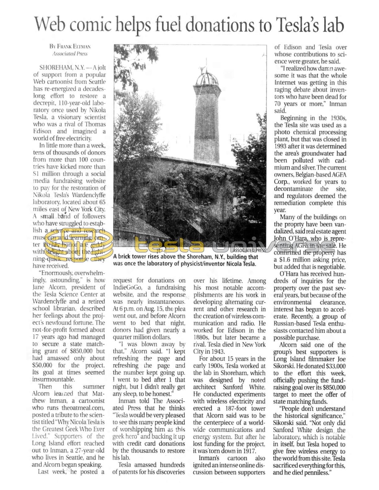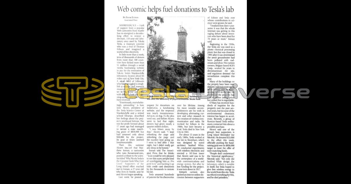 SHOREHAM, N.Y. — A jolt of support from a popular Web cartoonist from Seattle has re-energized a decades-long effort to restore a decrepit, 110-year-old laboratory once used by Nikola Tesla, a visionary scientist who was a rival of Thomas Edison and imagined a world of free electricity.