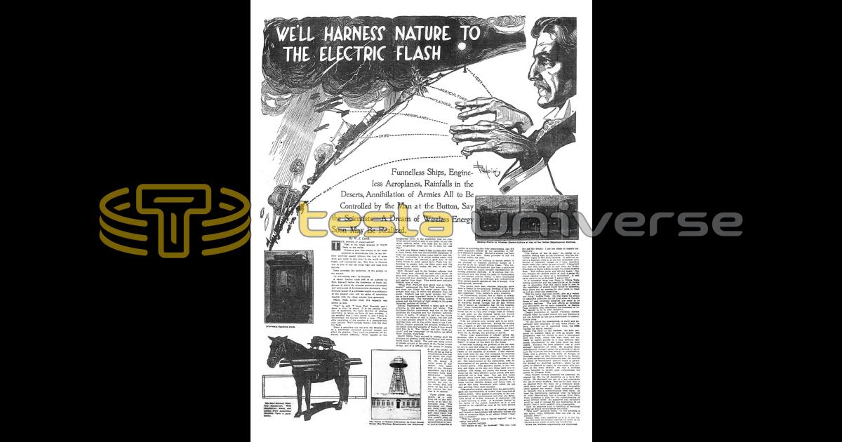 Nikola Tesla Articles Newspaper and magazine articles related to Nikola Tesla “We'll Harness Nature to the Electric Flash” (Reprint) Seattle Post December 11th, 1910 This article is a reprint from the New York World of December 4, 1910 and is intentionally not duplicated here. Downloads Downloads for this article are available to members.Log in or join today to access all content. Downloads Downloads for this article are available to members.Log in or join today to access all content. Pagination Enjoy other articles First First item Previous Previous item Next Next item Last Last item Within the Universe Timeline Important moments and events related to Tesla. Articles Nikola Tesla in the press. Books Books written by and about Nikola Tesla. Documents Nikola Tesla documents, files and papers. Quotes Profound and insightful quotes by Nikola Tesla. Movies and TV Nikola Tesla on the screen. Patents Nikola Tesla held around 200 patents worldwide. Landmarks Locations related to Nikola Tesla. Images Nikola Tesla image and photo library. Show more Pagination Enjoy other articles First First item Previous Previous item Next Next item Last Last item Within the Universe Documents Nikola Tesla documents, files and papers. Quotes Profound and insightful quotes by Nikola Tesla. Books Books written by and about Nikola Tesla. Timeline Important moments and events related to Tesla. Patents Nikola Tesla held around 200 patents worldwide. Images Nikola Tesla image and photo library. Landmarks Locations related to Nikola Tesla. Letters Letters to, from and about Nikola Tesla. Movies and TV Nikola Tesla on the screen.
