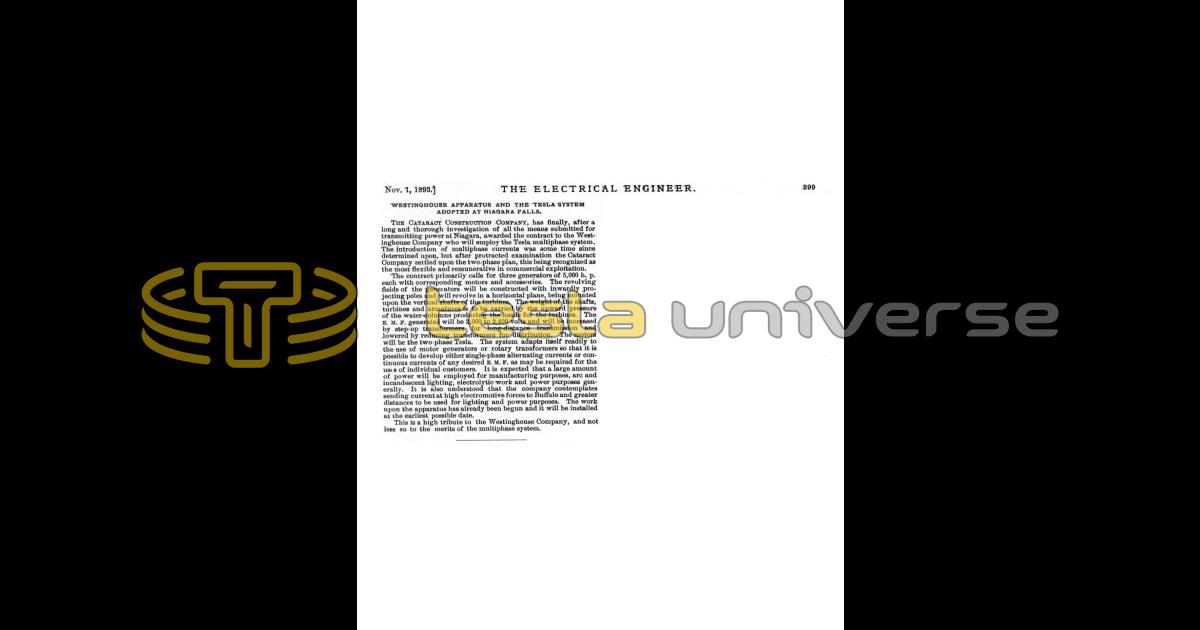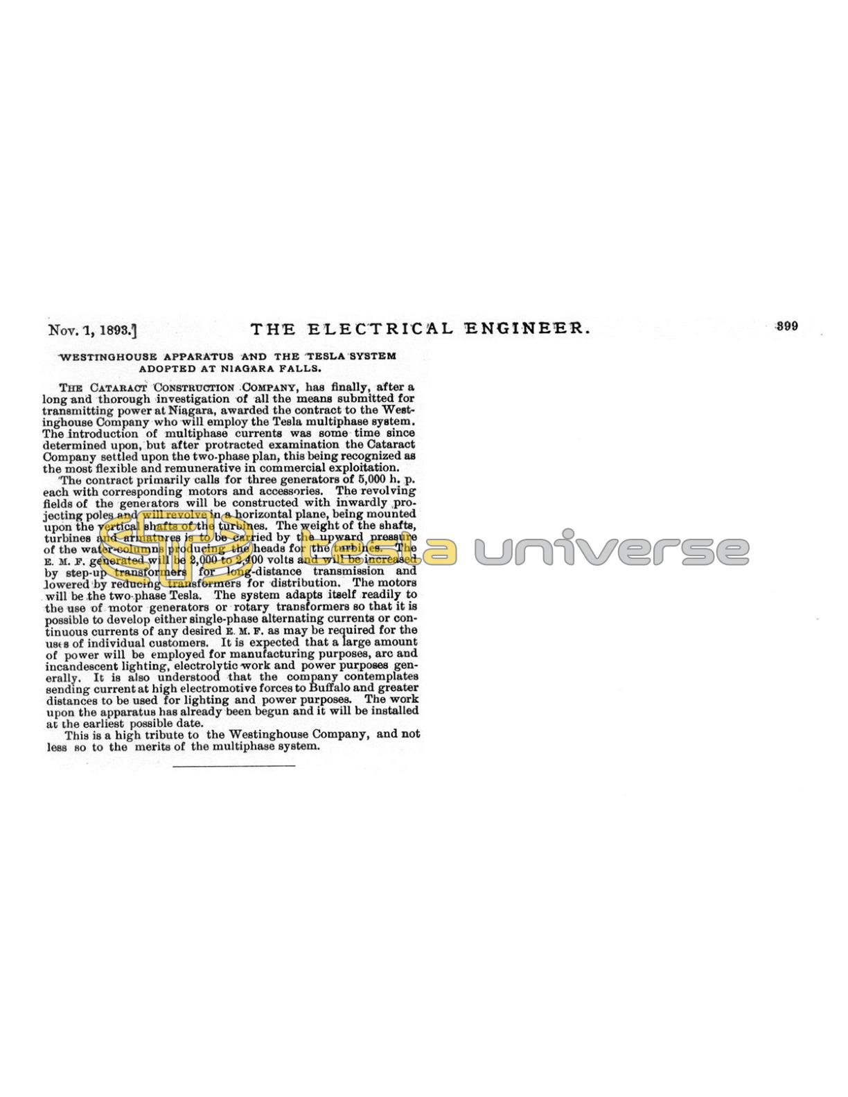 The Cataract Construction Company, has finally, after a long and thorough investigation of all the means submitted for transmitting power at Niagara, awarded the contract to the Westinghouse Company who will employ the Tesla multiphase system. The introduction of multiphase currents was some time since determined upon, but after protracted examination the Cataract Company settled upon the two-phase plan, this being recognized as the most flexible and remunerative in commercial exploitation.