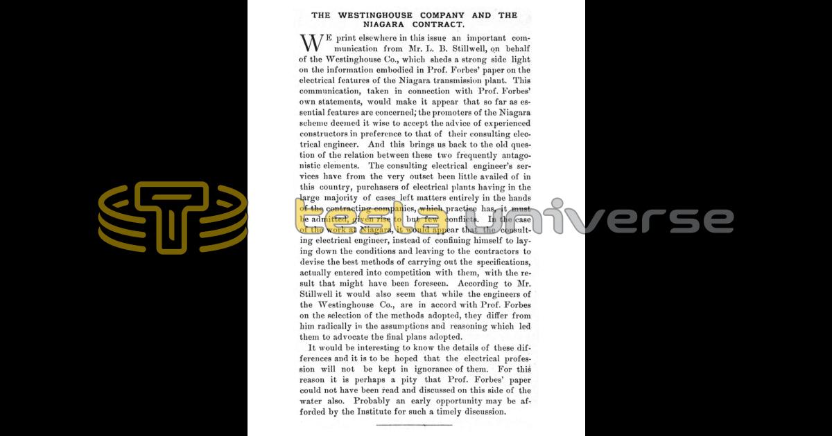 We print elsewhere in this issue an important communication from Mr. L. B. Stillwell, on behalf of the Westinghouse Co., which sheds a strong side light on the information embodied in Prof. Forbes' paper on the electrical features of the Niagara transmission plant. This communication, taken in connection with Prof. Forbes' own statements, would make it appear that so far as essential features are concerned; the promoters of the Niagara scheme deemed it wise to accept the advice of experienced constructors in preference to that of their consulting electrical engineer. And this brings us back to the old question of the relation between these two frequently antagonistic elements. The consulting electrical engineer's services have from the very outset been little availed of in this country, purchasers of electrical plants having in the large majority of cases left matters entirely in the hands of the contracting companies, which practice has, it must be admitted, given rise to but few conflicts. In the case of the work at Niagara, it would appear that the consulting electrical engineer, instead of confining himself to laying down the conditions and leaving to the contractors to devise the best methods of carrying out the specifications, actually entered into competition with them, with the result that might have been foreseen. According to Mr. Stillwell it would also seem that while the engineers of the Westinghouse Co., are in accord with Prof. Forbes on the selection of the methods adopted, they differ from him radically in the assumptions and reasoning which led them to advocate the final plans adopted.