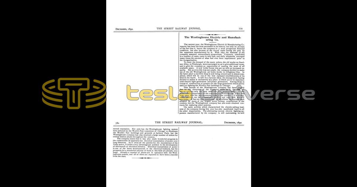 The current year, the Westinghouse Electric & Manufacturing Co. reports, has been the most successful in its history, not only on account of the fact that it leaves the company in a most prosperous financial condition, but also because of the record made during the year by the apparatus manufactured by it. With 1892 the business of the company assumed extraordinary proportions. Contracts, unsolicited in a number of cases, came in very fast, and daily shipments averaged many times the amount of what had ever been experienced prior to the reorganization.