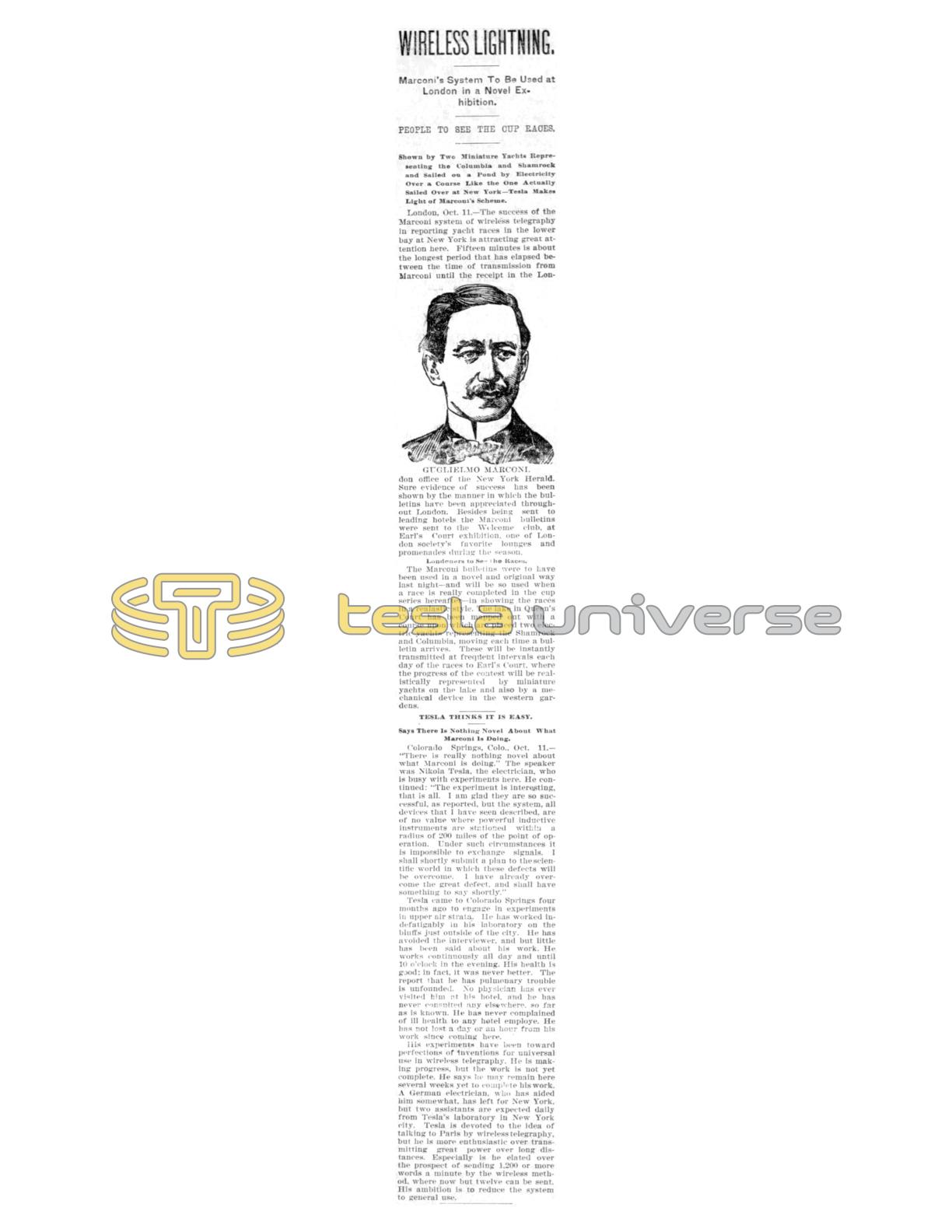 Colorado Springs, Colo., Oct. 11. — "There is really nothing novel about what Marconi is doing." The speaker was Nikola Tesla, the electrician, who is busy with experiments here. He continued: "The experiment is interesting, that is all. I am glad they are so successful, as reported, but the system, all devices that I have seen described, are of no value where powerful inductive instruments are stationed within a radius of 200 miles of the point of operation. Under such circumstances it is impossible to exchange signals. I shall shortly submit a plan to the scientific world in which these defects will be overcome. I have already overcome the great defect, and shall have something to say shortly."
