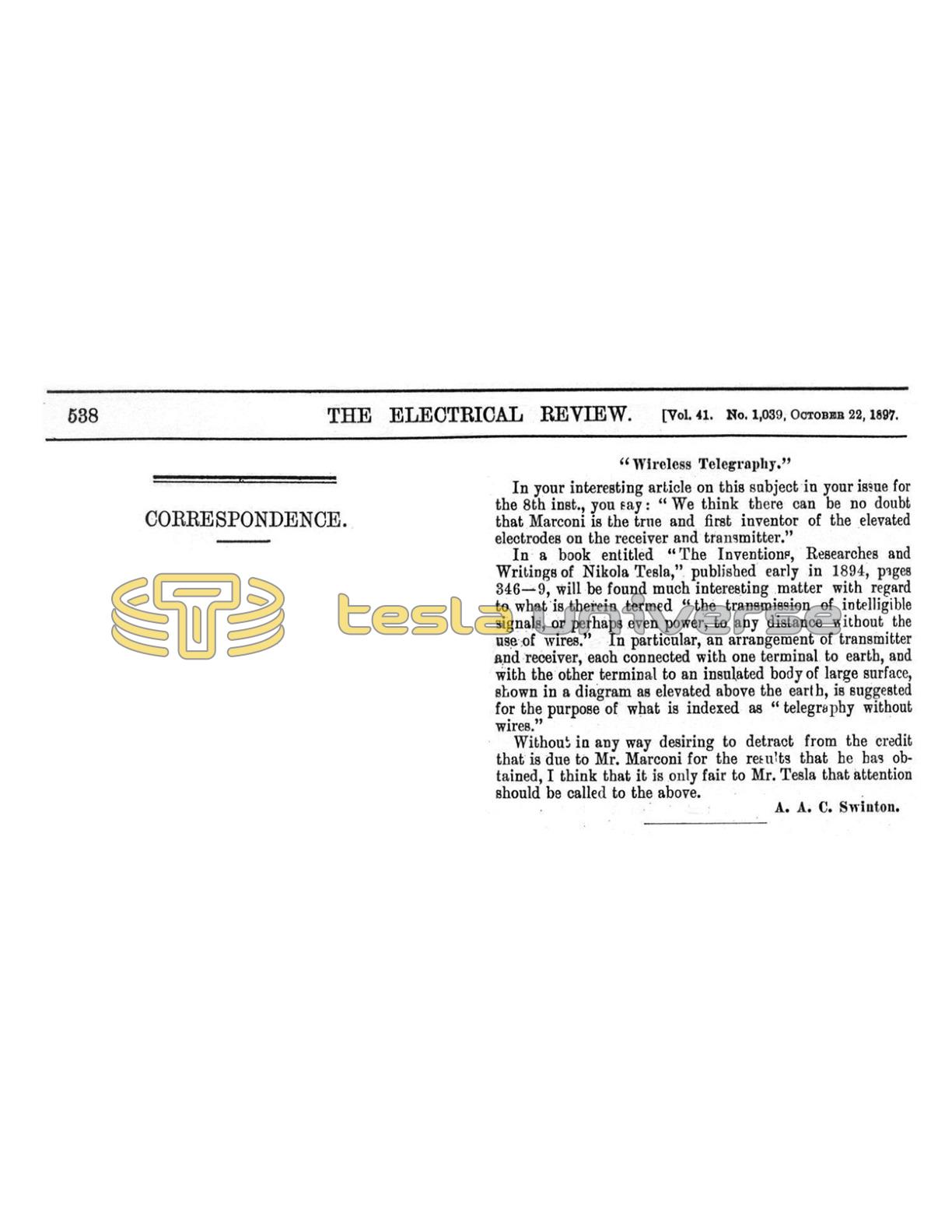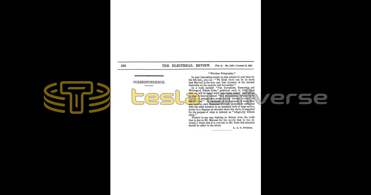 Without in any way desiring to detract from the credit that is due to Mr. Marconi for the results that he has obtained, I think that it is only fair to Mr. Tesla that attention should be called to the above.