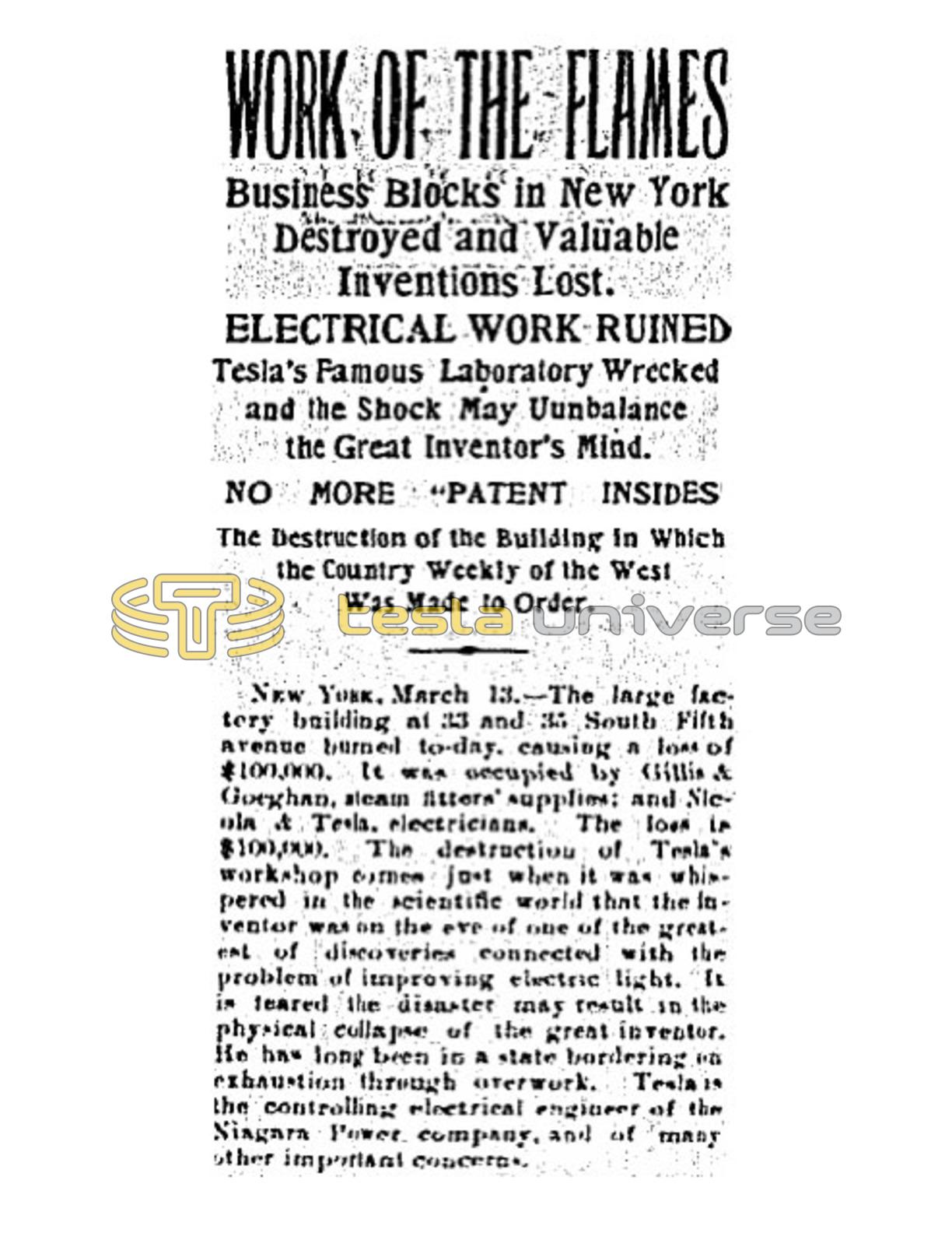 New York, March 13. — The large factory building at 33 and 35 South Fifth avenue burned to-day causing a loss of $100,000. It was occupied by Gillis & Geoghegan, steam fitters supplies; and Nicola & Tesla, electricians. The loss is $100,000. The destruction of Tesla’s workshop comes just when it was whispered in the scientific world that the inventor was on the eve of one of the greatest of discoveries connected with the problem of improving electric light. It is feared the disaster may result in the physical collapse of the great inventor. He has long been in a state bordering on exhaustion through overwork. Tesla is the controlling engineer of the Niagara Power company, and of many other important concerns.