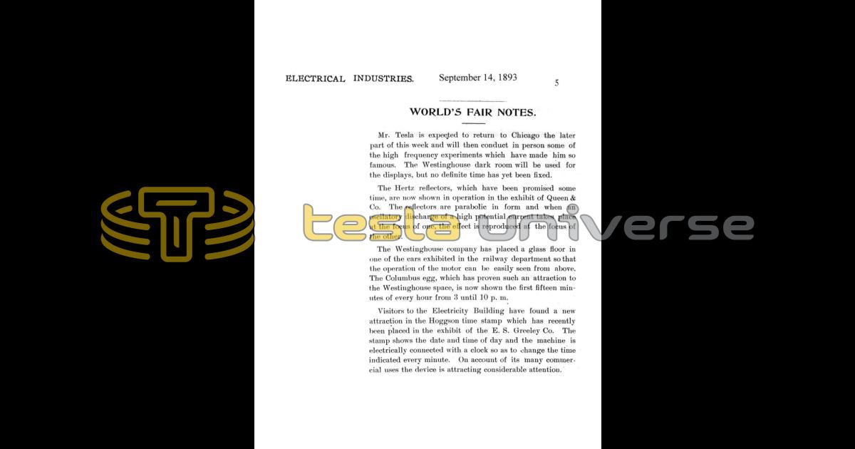 Mr. Tesla is expected to return to Chicago the later part of this week and will then conduct in person some of the high frequency experiments which have made him so famous. The Westinghouse dark room will be used for the displays, but no definite time has yet been fixed.