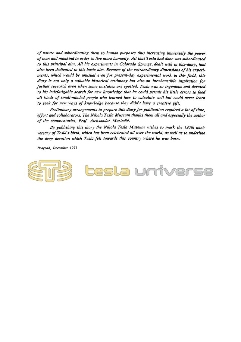 By publishing this diary the Nikola Tesla Museum wishes to mark the 120th anniversary of Tesla's birth, which has been celebrated all over the world, as well as to underline the deep devotion which Tesla felt towards this country where he was born.