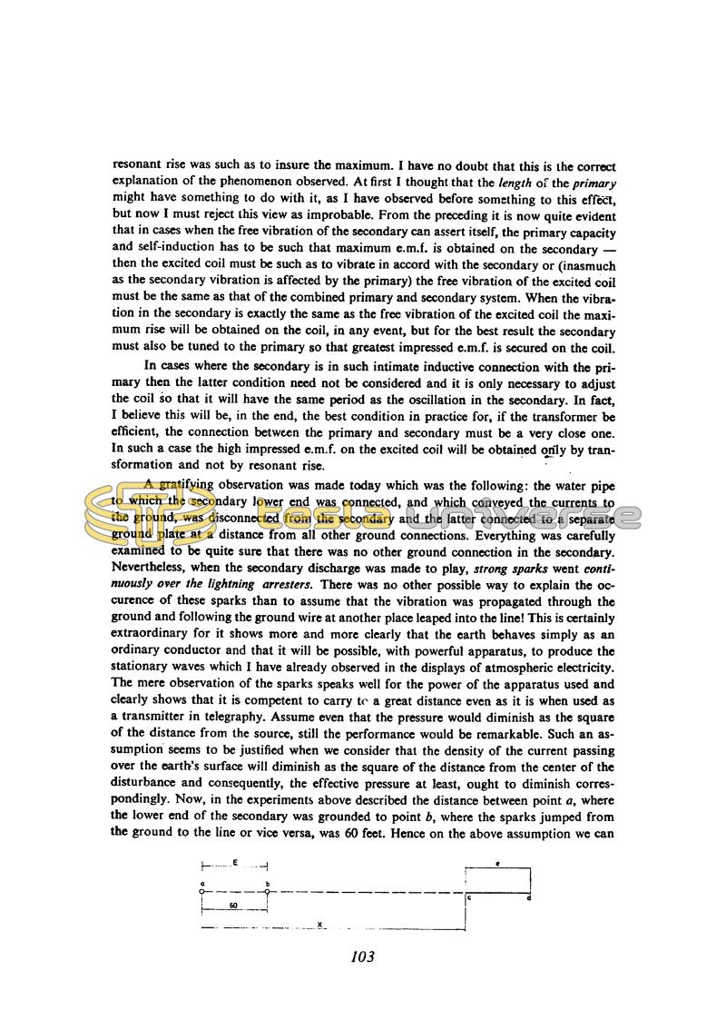 A gratifying observation was made today which was the following: the water pipe to which the secondary lower end was connected, and which conveyed the currents to the ground, was disconnected from the secondary and the latter connected to a separate ground plate at a distance from all other ground connections. Everything was carefully examined to be quite sure that there was no other ground connection in the secondary. Nevertheless, when the secondary discharge was made to play, strong sparks went continuously over the lightning arresters. There was no other possible way to explain the occurrence of these sparks than to assume that the vibration was propagated through the ground and following the ground wire at another place leaped into the line! This is certainly extraordinary for it shows more and more clearly that the earth behaves simply as an ordinary conductor and that it will be possible, with powerful apparatus, to produce the stationary waves which I have already observed in the displays of atmospheric electricity. The mere observation of the sparks speaks well for the power of the apparatus used and clearly shows that it is competent to carry to a great distance even as it is when used as a transmitter in telegraphy. Assume even that the pressure would diminish as the square of the distance from the source, still the performance would be remarkable. Such an assumption seems to be justified when we consider that the density of the current passing over the earth's surface will diminish as the square of the distance from the center of the disturbance and consequently, the effective pressure at least, ought to diminish correspondingly. Now, in the experiments above described the distance between point a, where the lower end of the secondary was grounded to point b, where the sparks jumped from the ground to the line or vice versa, was 60 feet. Hence on the above assumption we can
