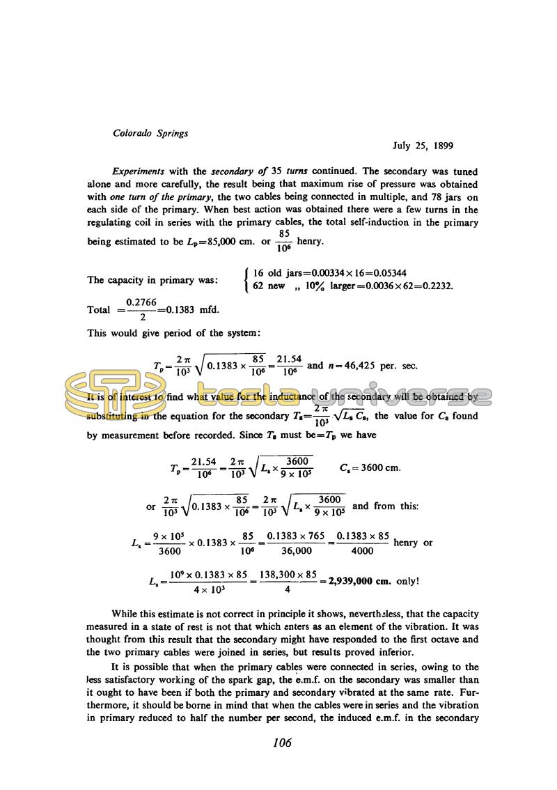 Experiments with the secondary of 35 turns continued. The secondary was tuned alone and more carefully, the result being that maximum rise of pressure was obtained with one turn of the primary, the two cables being connected in multiple, and 78 jars on each side of the primary. When best action was obtained there were a few turns in the regulating coil in series with the primary cables, the total self-induction in the primary being estimated to be Lp = 85,000 cm. or !$ {85 \over 10^{6}} !$ henry.