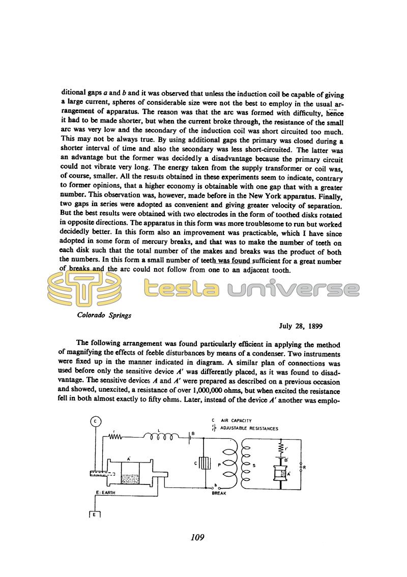 ditional gaps a and b and it was observed that unless the induction coil be capable of giving a large current, spheres of considerable size were not the best to employ in the usual arrangement of apparatus. The reason was that the arc was formed with difficulty, hence it had to be made shorter, but when the current broke through, the resistance of the small arc was very low and the secondary of the induction coil was short circuited too much. This may not be always true. By using additional gaps the primary was closed during a shorter interval of time and also the secondary was less short-circuited. The latter was an advantage but the former was decidedly a disadvantage because the primary circuit could not vibrate very long. The energy taken from the supply transformer or coil was, of course, smaller. All the results obtained in these experiments seem to indicate, contrary to former opinions, that a higher economy is obtainable with one gap that with a greater number. This observation was, however, made before in the New York apparatus. Finally, two gaps in series were adopted as convenient and giving greater velocity of separation. But the best results were obtained with two electrodes in the form of toothed disks rotated in opposite directions. The apparatus in this form was more troublesome to run but worked decidedly better. In this form also an improvement was practicable, which I have since adopted in some form of mercury breaks, and that was to make the number of teeth on each disk such that the total number of the makes and breaks was the product of both the numbers. In this form a small number of teeth was found sufficient for a great number of breaks and the arc could not follow from one to an adjacent tooth.