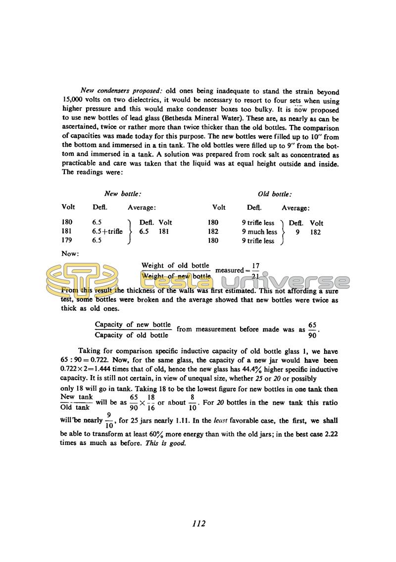 Taking for comparison specific inductive capacity of old bottle glass 1, we have 65:90=0.722. Now, for the same glass, the capacity of a new jar would have been 0.722x2=1.444 times that of old, hence the new glass has 44.4% higher specific inductive capacity. It is still not certain, in view of unequal size, whether 25 or 20 or possibly only 18 will go in tank. Taking 18 to be the lowest figure for new bottles in one tank then !${New \, tank \over Old \, tank}!$ will be as !${{65 \over 90} \times {18 \over 16}}!$ or about !$8\over10!$. For 20 bottles in the new tank this ratio will be nearly !$9\over10!$, for 25 jars nearly 1.11. In the least favorable case, the first, we shall be able to transform at least 60% more energy than with the old jars; in the best case 2.22 times as much as before. This is good.