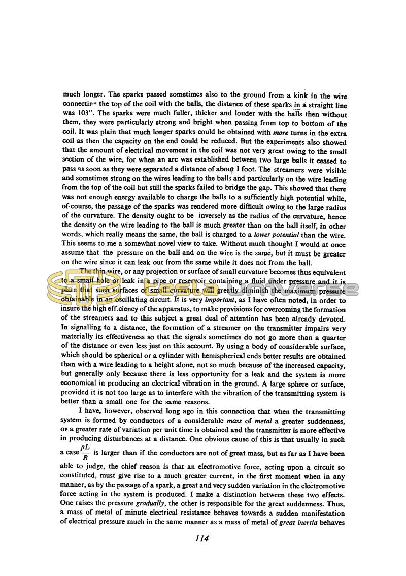 much longer. The sparks passed sometimes also to the ground from a kink in the wire connecting the top of the coil with the balls, the distance of these sparks in a straight line was 103". The sparks were much fuller, thicker and louder with the balls then without them, they were particularly strong and bright when passing from top to bottom of the coil. It was plain that much longer sparks could be obtained with more turns in the extra coil as then the capacity on the end could be reduced. But the experiments also showed that the amount of electrical movement in the coil was not very great owing to the small section of the wire, for when an arc was established between two large balls it ceased to pass as soon as they were separated a distance of about 1 foot. The streamers were visible and sometimes strong on the wires leading to the balls and particularly on the wire leading from the top of the coil but still the sparks failed to bridge the gap. This showed that there was not enough energy available to charge the balls to a sufficiently high potential while, of course, the passage of the sparks was rendered more difficult owing to the large radius of the curvature. The density ought to be inversely as the radius of the curvature, hence the density on the wire leading to the ball is much greater than on the ball itself, in other words, which really means the same, the ball is charged to a lower potential than the wire. This seems to me a somewhat novel view to take. Without much thought I would at once assume that the pressure on the ball and on the wire is the same, but it must be greater on the wire since it can leak out from the same while it does not from the ball.
