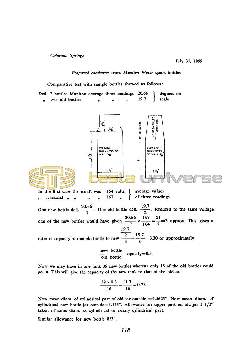 One new bottle defl. !$ {20.66 \over 7} !$. One old bottle defl. !$ {19.7 \over 2} !$. Reduced to the same voltage one of the new bottles would have given 20.66/7 x 167/164 = 21/7 = 3 approx. This gives a ratio of capacity of one old bottle to new !$ {{19.7 \over {2 \over 3}} = {19.7 \over 6} = 3.30} !$ or approximately
