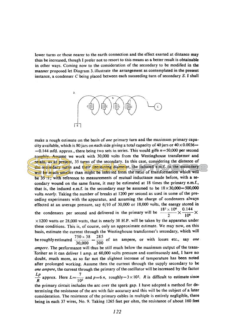 This would give n = 50,000 per second roughly. Assume we work with 30,000 volts from the Westinghouse transformer and retain, as at present, 35 turns of the secondary. In this case, considering the distance of the secondary turns and their decreasing diameter, the induced e.m.f. in the secondary will be much smaller than might be inferred from the ratio of transformation which will be 35:1; with reference to measurements of mutual inductance made before, with a secondary wound on the same frame, it may be estimated at 18 times the primary e.m.f., that is, the induced e.m.f. in the secondary may be assumed to be 18 x 30,000 = 500,000 volts nearly. Taking the number of breaks at 1200 per second as used in some of the preceding experiments with the apparatus, and assuming the charge of condensers always effected at an average pressure, say 6/10 of 30,000 or 18,000 volts, the energy stored in the condensers per second and delivered in the primary will be !$ {{{18^{2} \times 10^{6}} \over 2} \times {0.144 \over 10^{6}} \times 1200} !$ watts or 28,000 watts, that is nearly 38 H.P. will be taken by the apparatus under these conditions. This is, of course, only an approximate estimate. We may now, on this basis, estimate the current through the Westinghouse transformer's secondary, which will be roughly estimated !$ {{{750 \times 38} \over 30,000} = {285 \over 300}} !$ of an ampere, or with losses etc., say one ampere. The performance will thus be still much below the maximum output of the transformer as it can deliver 1 amp. at 60,000 volts pressure and continuously and, I have no doubt, much more, as so far not the slightest increase of temperature has been noted after prolonged working. Assume then the current through the supply secondary to be one ampere, the current through the primary of the oscillator will be increased by the factor !$ {Lp \over R} !$ approx. Here !$ {L = {7 \over 10^{5}}} !$ and p = 6n, roughly = 3 x 105. R is difficult to estimate since the primary circuit includes the arc over the spark gap. 1 have adopted a method for determining the resistance of the arc with fair accuracy and this will be the subject of a later consideration. The resistance of the primary cables in multiple is entirely negligible, there being in each 37 wires. No. 9. Taking 1265 feet per ohm, the resistance of about 160 feet