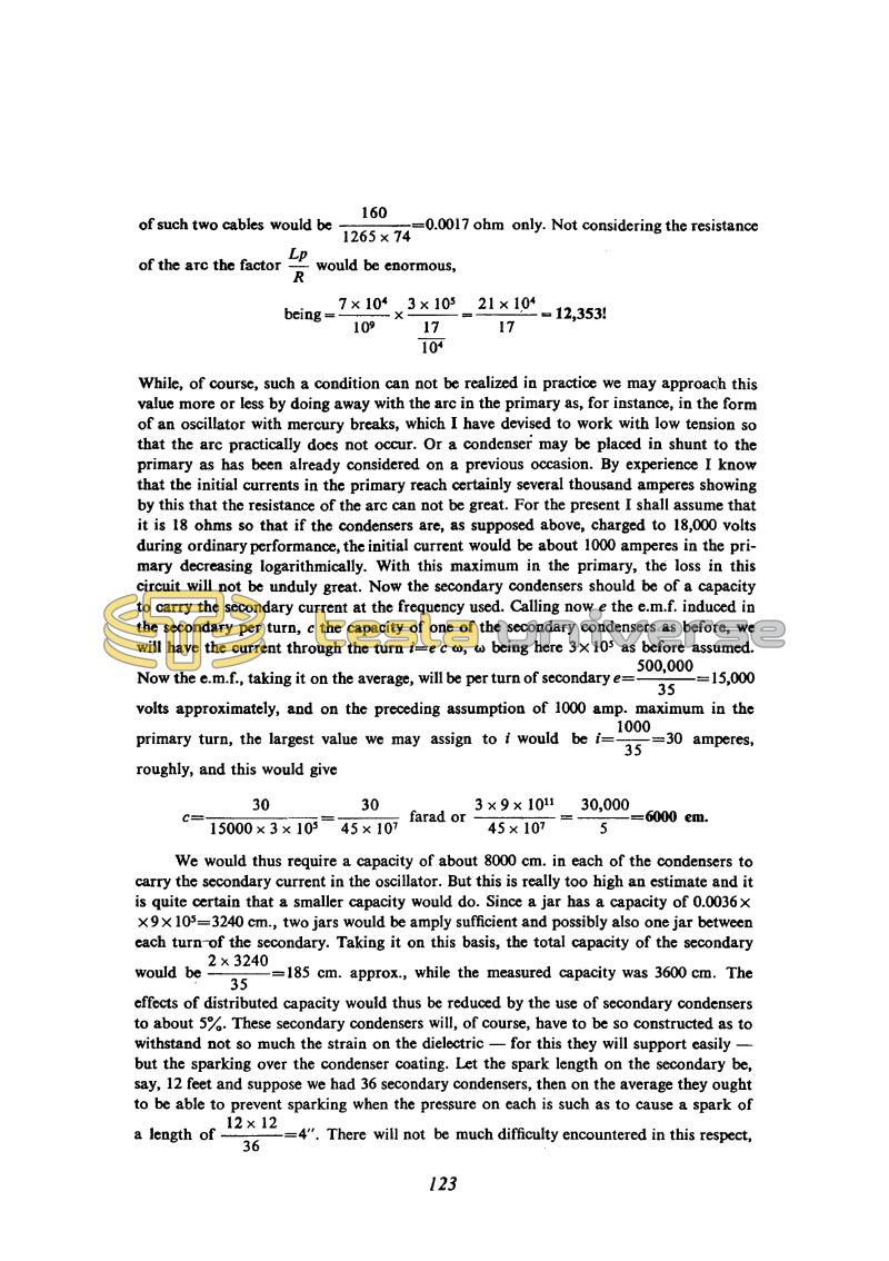 While, of course, such a condition can not be realized in practice we may approach this value more or less by doing away with the arc in the primary as, for instance, in the form of an oscillator with mercury breaks, which I have devised to work with low tension so that the arc practically does not occur. Or a condenser may be placed in shunt to the primary as has been already considered on a previous occasion. By experience I know that the initial currents in the primary reach certainly several thousand amperes showing by this that the resistance of the arc can not be great. For the present I shall assume that it is 18 ohms so that if the condensers are, as supposed above, charged to 18,000 volts during ordinary performance, the initial current would be about 1000 amperes in the primary decreasing logarithmically. With this maximum in the primary, the loss in this circuit will not be unduly great. Now the secondary condensers should be of a capacity to carry the secondary current at the frequency used. Calling now e the e.m.f. induced in the secondary per turn, c the capacity of one of the secondary condensers as before, we will have the current through the turn i=e c Ï, Ï being here 3 x 105 as before assumed. Now the e.m.f., taking it on the average, will be per turn of secondary e = !$ {500,000 \over 35} !$ = 15,000 volts approximately, and on the preceding assumption of 1000 amp. maximum in the primary turn, the largest value we may assign to i would be i = !$ {1000 \over 35} !$ = 30 amperes, roughly, and this would give