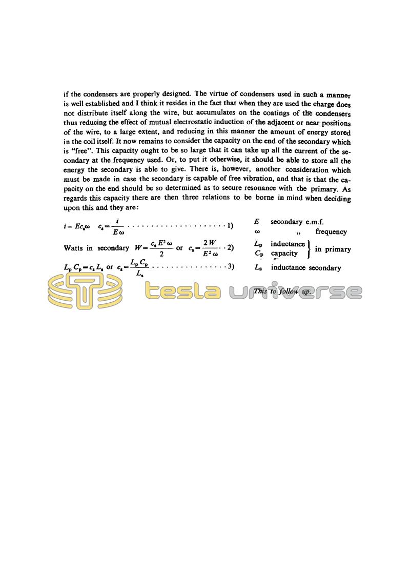 if the condensers are properly designed. The virtue of condensers used in such a manner is well established and I think it resides in the fact that when they are used the charge does not distribute itself along the wire, but accumulates on the coatings of the condensers thus reducing the effect of mutual electrostatic induction of the adjacent or near positions of the wire, to a large extent, and reducing in this manner the amount of energy stored in the coil itself. It now remains to consider the capacity on the end of the secondary which is "free". This capacity ought to be so large that it can take up all the current of the secondary at the frequency used. Or, to put it otherwise, it should be able to store all the energy the secondary is able to give. There is, however, another consideration which must be made in case the secondary is capable of free vibration, and that is that the capacity on the end should be so determined as to secure resonance with the primary. As regards this capacity there are then three relations to be borne in mind when deciding upon this and they are: