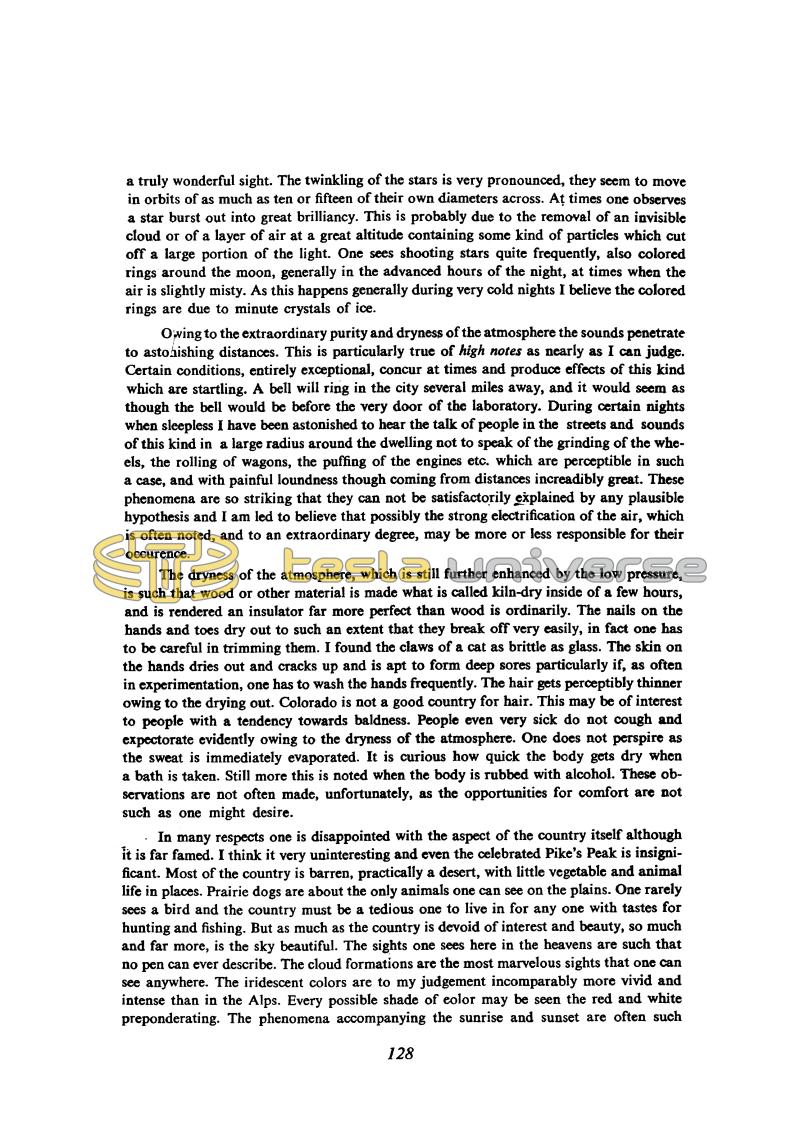 Extraordinary atmospherics in vicinity of laboratory instigated Tesla to devote some time to phenomena which are the consequence of a clean environment, dry air and low pressure. In such atmosphere sun and moonlight are more intensive than usual, the visibility is better, and even sounds propagate with less damping. The air is highly electrically charged, and according to Tesla that could be among other reasons, one of the reasons for this phenomena. Although the surrounding itself is not considered particularly attractive, Tesla is impressed with clouds, sunrise and sunset. His descriptions of these events are (literally - Editor) extraordinary, although they lack scientific preciseness and a systematical approach. This particularly pertains to descriptions of cloud types, and the description of some clouds' brightness which are brighter than the sun itself. Radiations, transformations of one kind of radiation to another and similar effects are known topics to Tesla and he uses his knowledge for the explanation of the events around him. In his considerations he grasped even the biological aspects of sun rays and atmosphere, and when he mentioned X-rays in connection with sun radiation, he expressed his hope that he will produce such intensity of these rays which will cure tuberculosis!