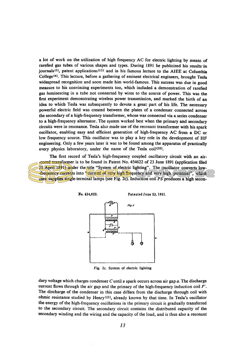 a lot of work on the utilization of high frequency AC for electric lighting by means of rarefied gas tubes of various shapes and types. During 1891 he publicized his results in journals(3), patent applications(15) and in his famous lecture to the AIEE at Columbia College(4). This lecture, before a gathering of eminent electrical engineers, brought Tesla widespread recognition and soon made him world-famous. This success was due in good measure to his convincing experiments too, which included a demonstration of rarefied gas luminescing in a tube not connected by wires to the source of power. This was the first experiment demonstrating wireless power transmission, and marked the birth of an idea to which Tesla was subsequently to devote a great part of his life. The necessary powerful electric field was created between the plates of a condenser connected across the secondary of a high-frequency transformer, whose was connected via a series condenser to a high-frequency alternator. The system worked best when the primary and secondary circuits were in resonance. Tesla also made use of the resonant transformer with his spark oscillator, enabling easy and efficient generation of high-frequency AC from a DC or low frequency source. This oscillator was to play a key role in the development of HF engineering. Only a few years later it was to be found among the apparatus of practically every physics laboratory, under the name of the Tesla coil(20).