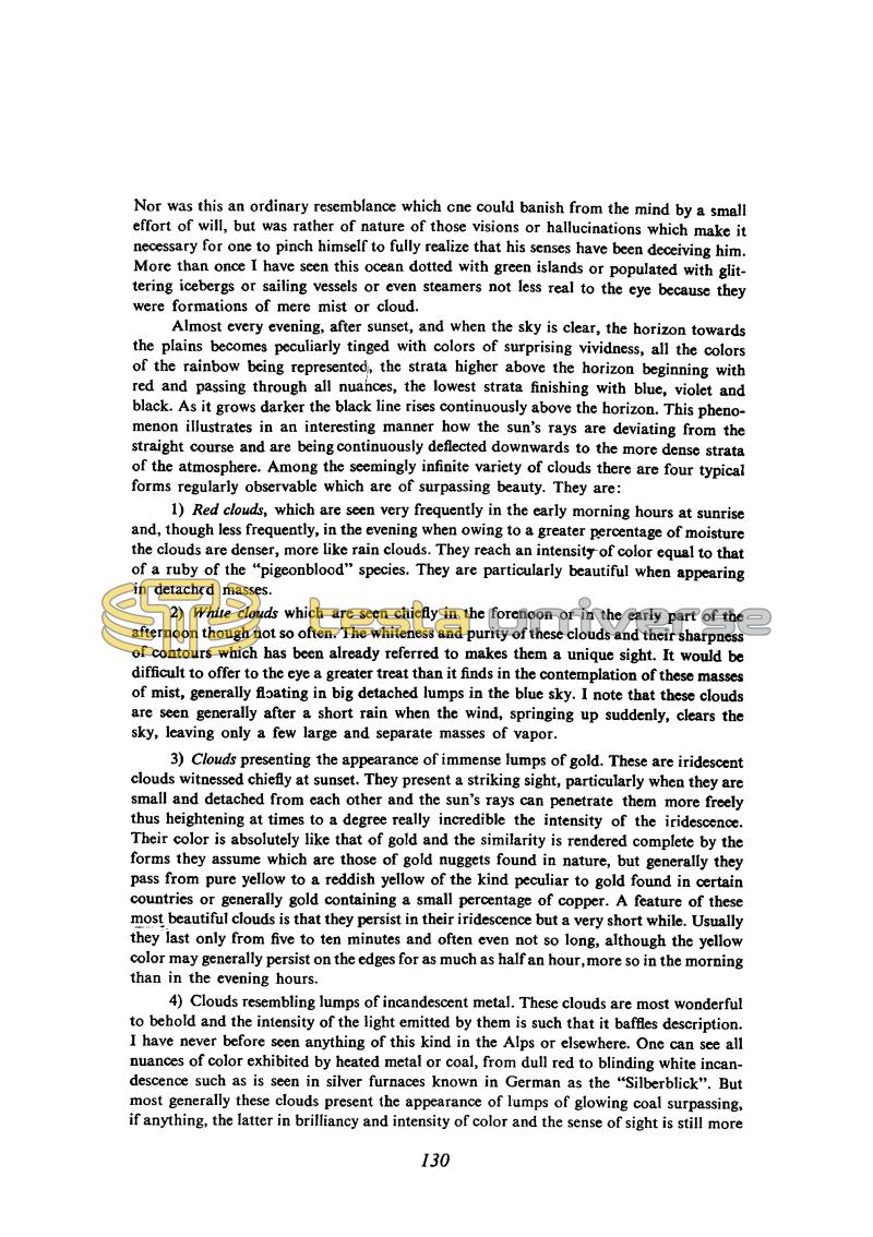 Almost every evening, after sunset, and when the sky is clear, the horizon towards the plains becomes peculiarly tinged with colors of surprising vividness, all the colors of the rainbow being represented, the strata higher above the horizon beginning with red and passing through all nuances, the lowest strata finishing with blue, violet and black. As it grows darker the black line rises continuously above the horizon. This phenomenon illustrates in an interesting manner how the sun's rays are deviating from the straight course and are being continuously deflected downwards to the more dense strata of the atmosphere. Among the seemingly infinite variety of clouds there are four typical forms regularly observable which are of surpassing beauty. They are: