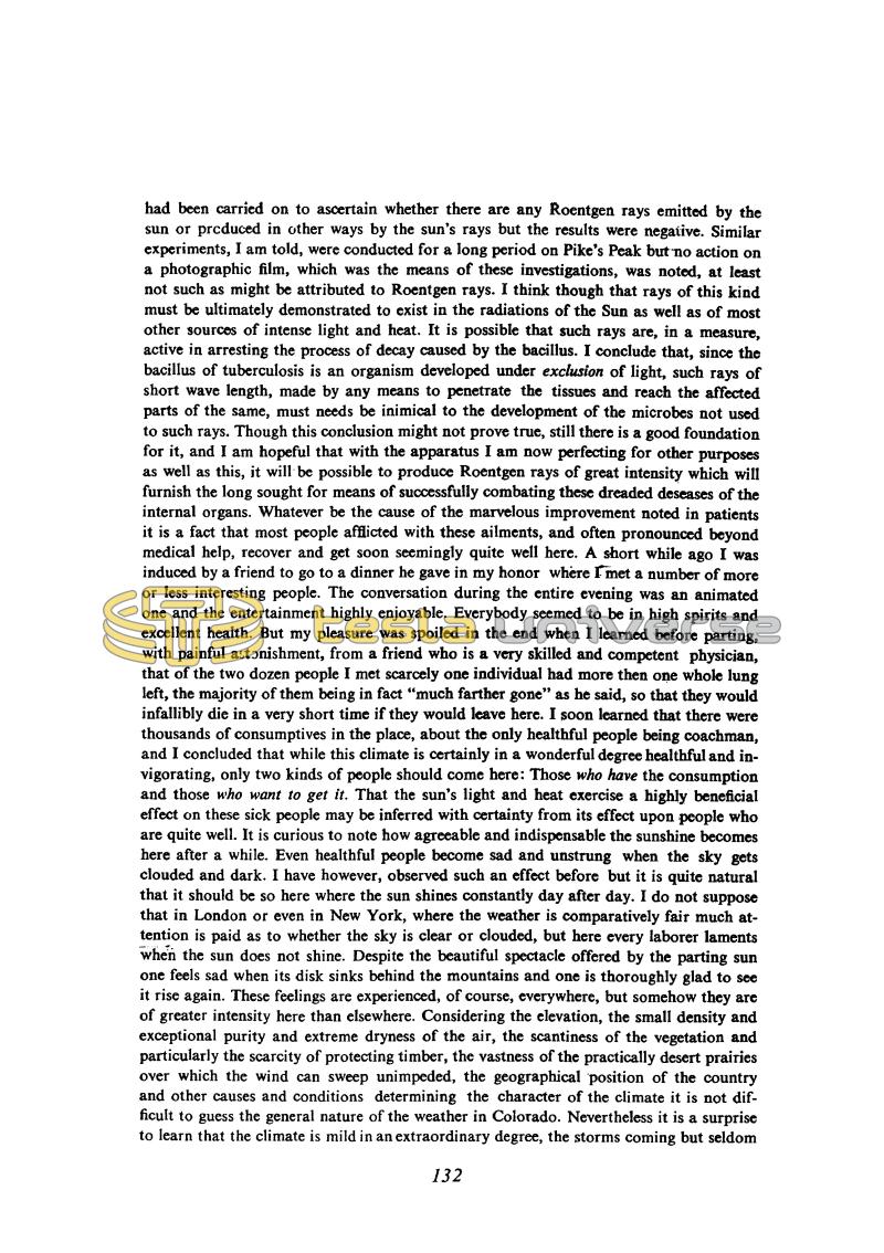 had been carried on to ascertain whether there are any Roentgen rays emitted by the sun or produced in other ways by the sun's rays but the results were negative. Similar experiments, I am told, were conducted for a long period on Pike's Peak but no action on a photographic film, which was the means of these investigations, was noted, at least not such as might be attributed to Roentgen rays. I think though that rays of this kind must be ultimately demonstrated to exist in the radiations of the Sun as well as of most other sources of intense light and heat. It is possible that such rays are, in a measure, active in arresting the process of decay caused by the bacillus. I conclude that, since the bacillus of tuberculosis is an organism developed under exclusion of light, such rays of short wave length, made by any means to penetrate the tissues and reach the affected parts of the same, must needs be inimical to the development of the microbes not used to such rays. Though this conclusion might not prove true, still there is a good foundation for it, and I am hopeful that with the apparatus I am now perfecting for other purposes as well as this, it will be possible to produce Roentgen rays of great intensity which will furnish the long sought for means of successfully combating these dreaded deceases of the internal organs. Whatever be the cause of the marvelous improvement noted in patients it is a fact that most people afflicted with these ailments, and often pronounced beyond medical help, recover and get soon seemingly quite well here. A short while ago I was induced by a friend to go to a dinner he gave in my honor where I met a number of more or less interesting people. The conversation during the entire evening was an animated one and the entertainment highly enjoyable. Everybody seemed to be in high spirits and excellent health. But my pleasure was spoiled in the end when I learned before parting, with painful astonishment, from a friend who is a very skilled and competent physician, that of the two dozen people I met scarcely one individual had more then one whole lung left, the majority of them being in fact "much farther gone" as he said, so that they would infallibly die in a very short time if they would leave here. I soon learned that there were thousands of consumptives in the place, about the only healthful people being coachman, and I concluded that while this climate is certainly in a wonderful degree healthful and invigorating, only two kinds of people should come here: Those who have the consumption and those who want to get it. That the sun's light and heat exercise a highly beneficial effect on these sick people may be inferred with certainty from its effect upon people who are quite well. It is curious to note how agreeable and indispensable the sunshine becomes here after a while. Even healthful people become sad and unstrung when the sky gets clouded and dark. I have however, observed such an effect before but it is quite natural that it should be so here where the sun shines constantly day after day. I do not suppose that in London or even in New York, where the weather is comparatively fair much attention is paid as to whether the sky is clear or clouded, but here every laborer laments when the sun does not shine. Despite the beautiful spectacle offered by the parting sun one feels sad when its disk sinks behind the mountains and one is thoroughly glad to see it rise again. These feelings are experienced, of course, everywhere, but somehow they are of greater intensity here than elsewhere. Considering the elevation, the small density and exceptional purity and extreme dryness of the air, the scantiness of the vegetation and particularly the scarcity of protecting timber, the vastness of the practically desert prairies over which the wind can sweep unimpeded, the geographical position of the country and other causes and conditions determining the character of the climate it is not difficult to guess the general nature of the weather in Colorado. Nevertheless it is a surprise to learn that the climate is mild in an extraordinary degree, the storms coming but seldom