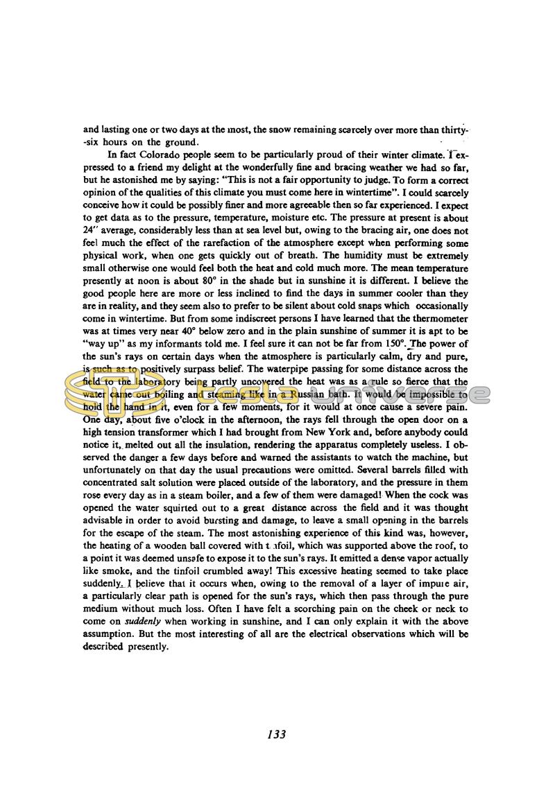 In fact Colorado people seem to be particularly proud of their winter climate. I expressed to a friend my delight at the wonderfully fine and bracing weather we had so far, but he astonished me by saying: "This is not a fair opportunity to judge. To form a correct opinion of the qualities of this climate you must come here in wintertime". I could scarcely conceive how it could be possibly finer and more agreeable then so far experienced. I expect to get data as to the pressure, temperature, moisture etc. The pressure at present is about 24" average, considerably less than at sea level but, owing to the bracing air, one does not feel much the effect of the rarefaction of the atmosphere except when performing some physical work, when one gets quickly out of breath. The humidity must be extremely small otherwise one would feel both the heat and cold much more. The mean temperature presently at noon is about 80° in the shade but in sunshine it is different. I believe the good people here are more or less inclined to find the days in summer cooler than they are in reality, and they seem also to prefer to be silent about cold snaps which occasionally come in wintertime. But from some indiscreet persons I have learned that the thermometer was at times very near 40° below zero and in the plain sunshine of summer it is apt to be "way up" as my informants told me. I feel sure it can not be far from 150°. The power of the sun's rays on certain days when the atmosphere is particularly calm, dry and pure, is such as to positively surpass belief. The waterpipe passing for some distance across the field to the laboratory being partly uncovered the heat was as a rule so fierce that the water came out boiling and steaming like in a Russian bath. It would be impossible to hold the hand in it, even for a few moments, for it would at once cause a severe pain. One day, about five o'clock in the afternoon, the rays fell through the open door on a high tension transformer which I had brought from New York and, before anybody could notice it, melted out all the insulation, rendering the apparatus completely useless. I observed the danger a few days before and warned the assistants to watch the machine, but unfortunately on that day the usual precautions were omitted. Several barrels filled with concentrated salt solution were placed outside of the laboratory, and the pressure in them rose every day as in a steam boiler, and a few of them were damaged! When the cock was opened the water squirted out to a great distance across the field and it was thought advisable in order to avoid bursting and damage, to leave a small opening in the barrels for the escape of the steam. The most astonishing experience of this kind was, however, the heating of a wooden ball covered with tinfoil, which was supported above the roof, to a point it was deemed unsafe to expose it to the sun's rays. It emitted a dense vapor actually like smoke, and the tinfoil crumbled away! This excessive heating seemed to take place suddenly. I believe that it occurs when, owing to the removal of a layer of impure air, a particularly clear path is opened for the sun's rays, which then pass through the pure medium without much loss. Often I have felt a scorching pain on the cheek or neck to come on suddenly when working in sunshine, and I can only explain it with the above assumption. But the most interesting of all are the electrical observations which will be described presently.