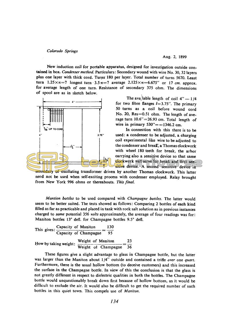These figures give a slight advantage to glass in Champagne bottle, but the latter was larger than the Maniton about 1/4" outside and contained a trifle over one quart. Furthermore, there is the usual hollow bottom (to deceive customers) and this increased the surface in the Champagne bottle. In view of this the conclusion is that the glass is not greatly different in respect to dielectric qualities in both the bottles. The Champagne bottle would unquestionably break down first because of hollow bottom, as it would be difficult to exclude the air. It would also be difficult to get the required number of such bottles in this quiet town. This compels use of Maniton.