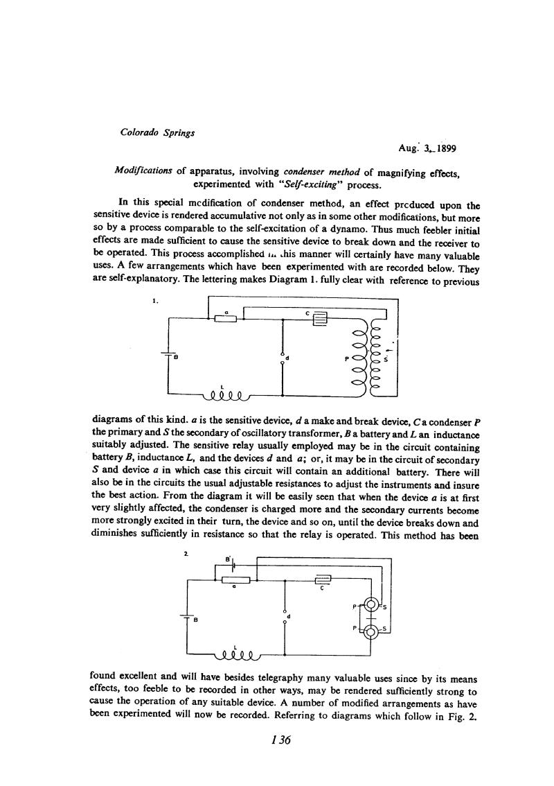Modifications of apparatus, involving condenser method of magnifying effects, experimented with âSelf-excitingâ process.