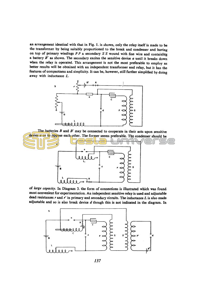 These experiments are a continuation of some earlier research. Here Tesla investigates various modifications of his "condenser method of magnifying effects". All the circuit diagrams of receivers, over 50, include at least one battery, sensitive device, condenser, rotary interrupter and HF transformer. Some of them show a relay for registering the signal received, while in others its presence is understood. Likewise, in all except one case (5 August, Fig. 1) the plates which brings the excitation to the sensitive device are not shown. Tesla says that these plates can be in one or two media, meaning that both can be in the air, both in the ground, or one in the air and the other in the ground, preferably elevated. In the patent(8), referring to these plates, he also says: "... they may be connected to conductors extending to some distance or to the terminals of any kind of apparatus supplying electrical energy which is obtained from the energy of impulses or disturbance through the natural media."*
