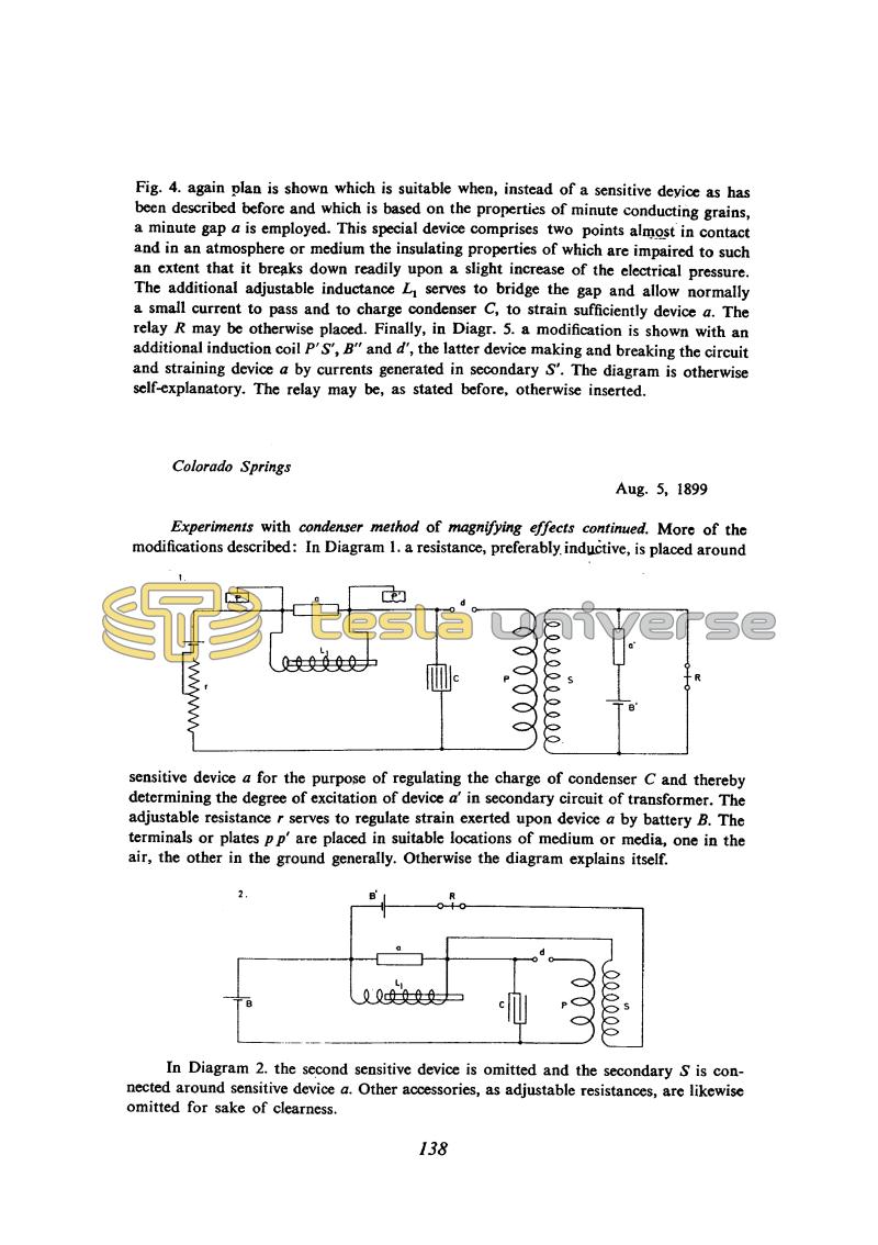 These experiments are a continuation of some earlier research. Here Tesla investigates various modifications of his "condenser method of magnifying effects". All the circuit diagrams of receivers, over 50, include at least one battery, sensitive device, condenser, rotary interrupter and HF transformer. Some of them show a relay for registering the signal received, while in others its presence is understood. Likewise, in all except one case (5 August, Fig. 1) the plates which brings the excitation to the sensitive device are not shown. Tesla says that these plates can be in one or two media, meaning that both can be in the air, both in the ground, or one in the air and the other in the ground, preferably elevated. In the patent(8), referring to these plates, he also says: "... they may be connected to conductors extending to some distance or to the terminals of any kind of apparatus supplying electrical energy which is obtained from the energy of impulses or disturbance through the natural media."*