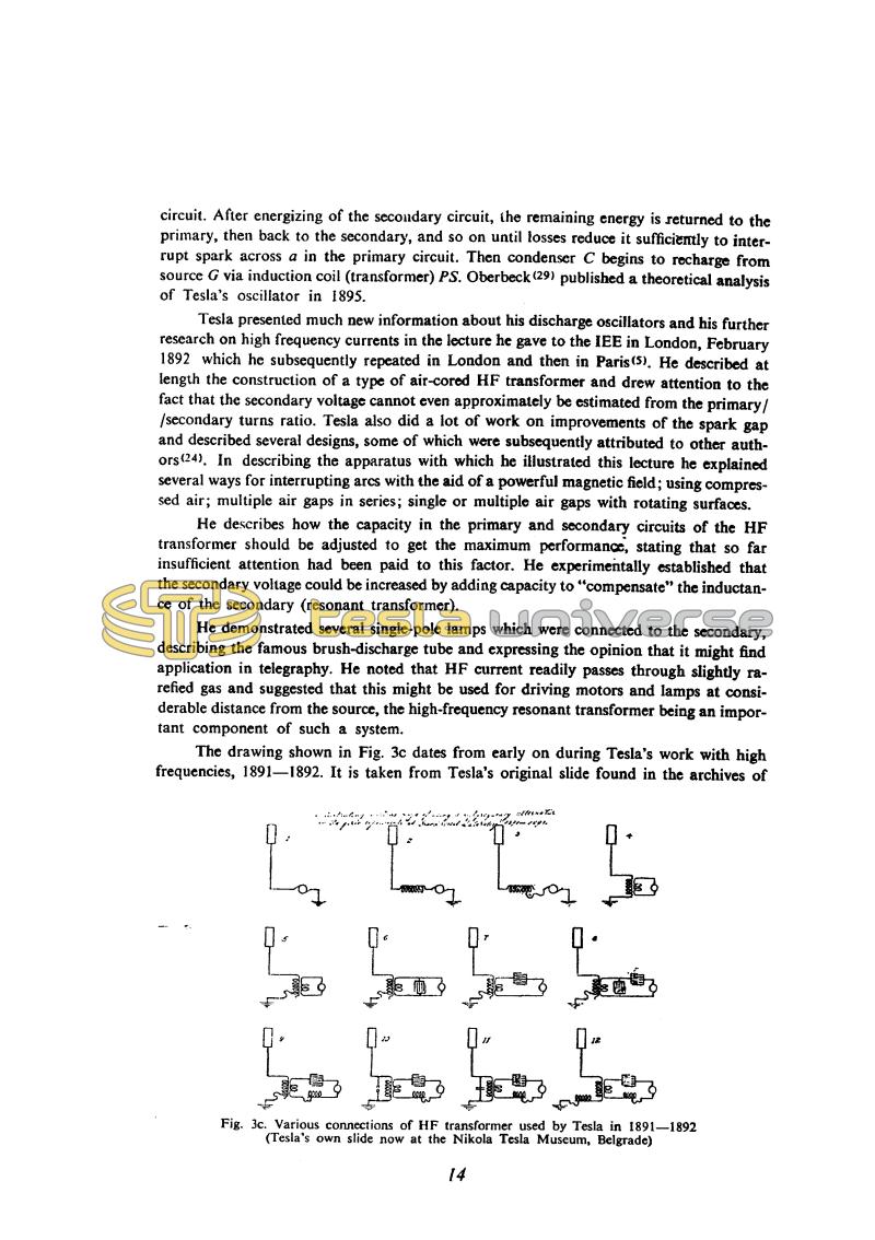 The drawing shown in Fig. 3c dates from early on during Tesla's work with high frequencies, 1891 - 1892. It is taken from Tesla's original slide found in the archives of