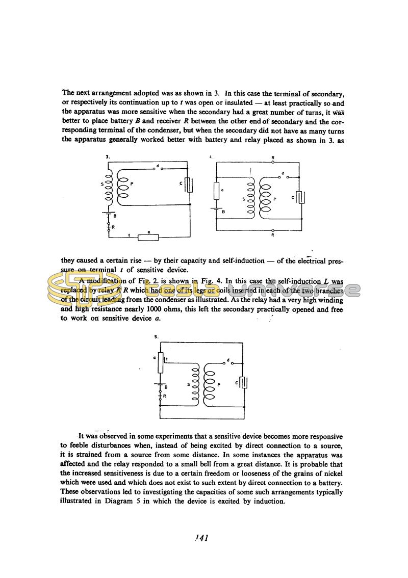 It was observed in some experiments that a sensitive device becomes more responsive to feeble disturbances when, instead of being excited by direct connection to a source, it is strained from a source from some distance. In some instances the apparatus was affected and the relay responded to a small bell from a great distance. It is probable that the increased sensitiveness is due to a certain freedom or looseness of the grains of nickel which were used and which does not exist to such extent by direct connection to a battery. These observations led to investigating the capacities of some such arrangements typically illustrated in Diagram 5 in which the device is excited by induction.
