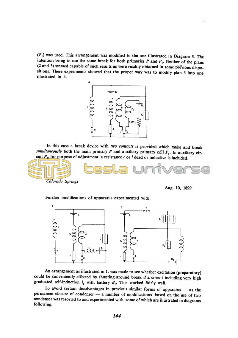 (P1) was used. This arrangement was modified to the one illustrated in Diagram 3. The intention being to use the same break for both primaries P and P1. Neither of the plans (2 and 3) seemed capable of such results as were readily obtained in some previous dispositions. These experiments showed that the proper way was to modify plan 3 into one illustrated in 4.
