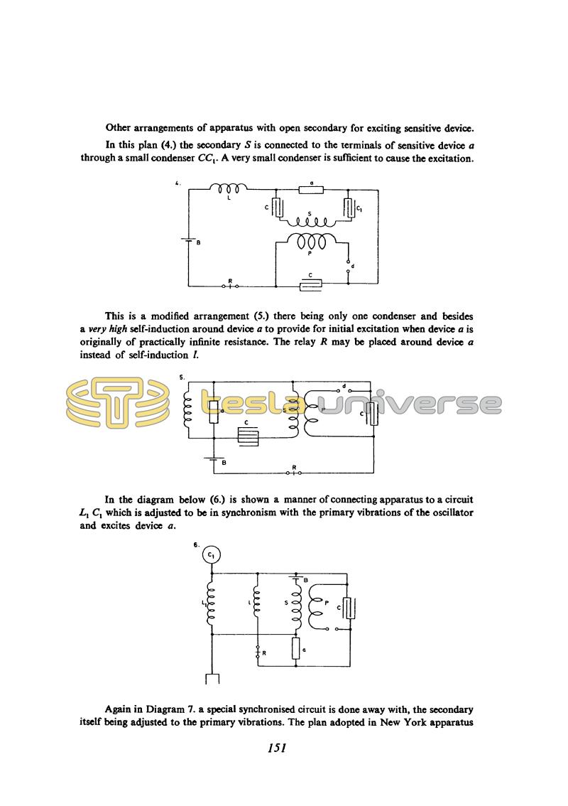 In this plan (4.) the secondary S is connected to the terminals of sensitive device a through a small condenser CC1. A very small condenser is sufficient to cause the excitation.