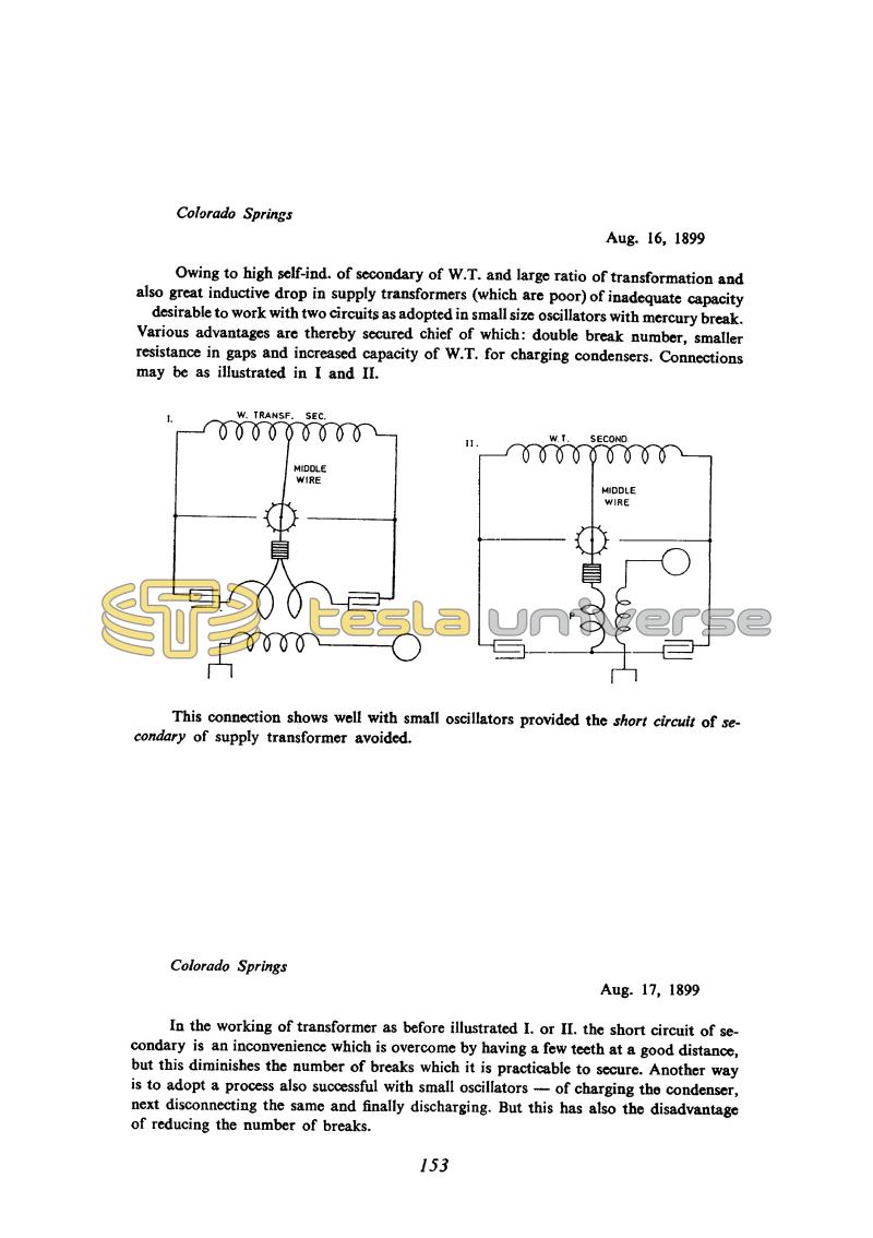 Owing to high self-ind. of secondary of W.T. and large ratio of transformation and also great inductive drop in supply transformers (which are poor) of inadequate capacity desirable to work with two circuits as adopted in small size oscillators with mercury break. Various advantages are thereby secured chief of which: double break number, smaller resistance in gaps and increased capacity of W.T. for charging condensers. Connections may be as illustrated in I and II.
