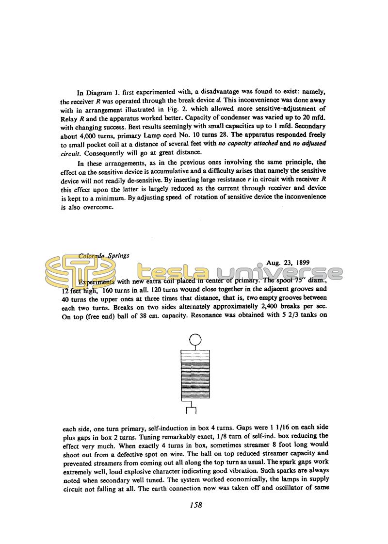He now put the extra coil in the center of the primary, retaining this configuration from then on. After the usual adjustment of the oscillator he got sparks 2 m, and later 4 m long, indicating a voltage of around 2 million volts.
