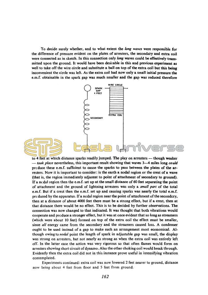 to 4 feet at which distance sparks readily jumped. The play on arresters - though weaker - took place nevertheless, this important result showing that waves 3 - 4 miles long could produce these e.m.f, sufficient to cause the sparks to pass between the plates of the arresters. Now it is important to consider: is the earth a nodal region or the crest of a wave (that is, the region immediately adjacent to point of attachment of secondary to ground). If a nodal region then the e.m.f. set up at the small distance of 60 feet separating the point of attachment and the ground of lightning arresters was only a small part of the total e.m.f. But if a crest then the e.m.f. set up and causing sparks was nearly the total e.m.f. produced by the apparatus. If a nodal region near the point of attachment of the secondary, then at a distance of about 4000 feet there must be a strong effect, but if a crest, then at that distance there would be no effect. This is to be decided by further observations. The connection was now changed to that indicated. It was thought that both vibrations would cooperate and produce a stronger effect, but it was at once evident that so long as streamers (which were about 10 feet) formed on top of the extra coil the effect must be smaller, since all energy came from the secondary and the streamers caused loss. A condenser ought to be used instead of a gap to make such an arrangement most economical. Although owing to nodal point the length of spark in adjustable gap was small, the display was strong on arresters, but not nearly as strong as when the extra coil was entirely left off. In the latter case the action was very rigorous so that often flames would form on arresters showing short circuit of dynamo. Also the other choking coil would break through. Evidently then the extra coil did not in this instance prove useful in intensifying vibration contemplated.