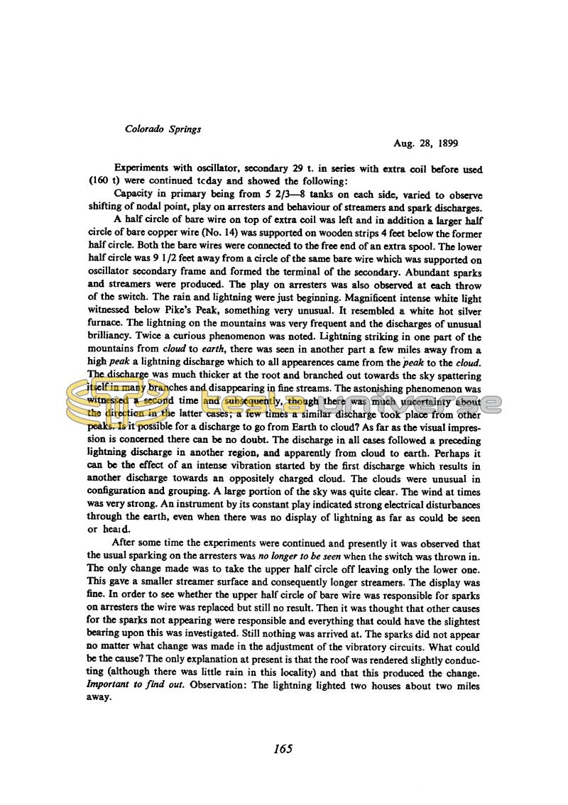 A half circle of bare wire on top of extra coil was left and in addition a larger half circle of bare copper wire (No. 14) was supported on wooden strips 4 feet below the former half circle. Both the bare wires were connected to the free end of an extra spool. The lower half circle was 9 1/2 feet away from a circle of the same bare wire which was supported on oscillator secondary frame and formed the terminal of the secondary. Abundant sparks and streamers were produced. The play on arresters was also observed at each throw of the switch. The rain and lightning were just beginning. Magnificent intense white light witnessed below Pike's Peak, something very unusual. It resembled a white hot silver furnace. The lightning on the mountains was very frequent and the discharges of unusual brilliancy. Twice a curious phenomenon was noted. Lightning striking in one part of the mountains from cloud to earth, there was seen in another part a few miles away from a high peak a lightning discharge which to all appearances came from the peak to the cloud. The discharge was much thicker at the root and branched out towards the sky spattering itself in many branches and disappearing in fine streams. The astonishing phenomenon was witnessed a second time and subsequently, though there was much uncertainty about the direction in the latter cases; a few times a similar discharge took place from other peaks. Is it possible for a discharge to go from Earth to cloud? As far as the visual impression is concerned there can be no doubt. The discharge in all cases followed a preceding lightning discharge in another region, and apparently from cloud to earth. Perhaps it can be the effect of an intense vibration started by the first discharge which results in another discharge towards an oppositely charged cloud. The clouds were unusual in configuration and grouping. A large portion of the sky was quite clear. The wind at times was very strong. An instrument by its constant play indicated strong electrical disturbances through the earth, even when there was no display of lightning as far as could be seen or heard.