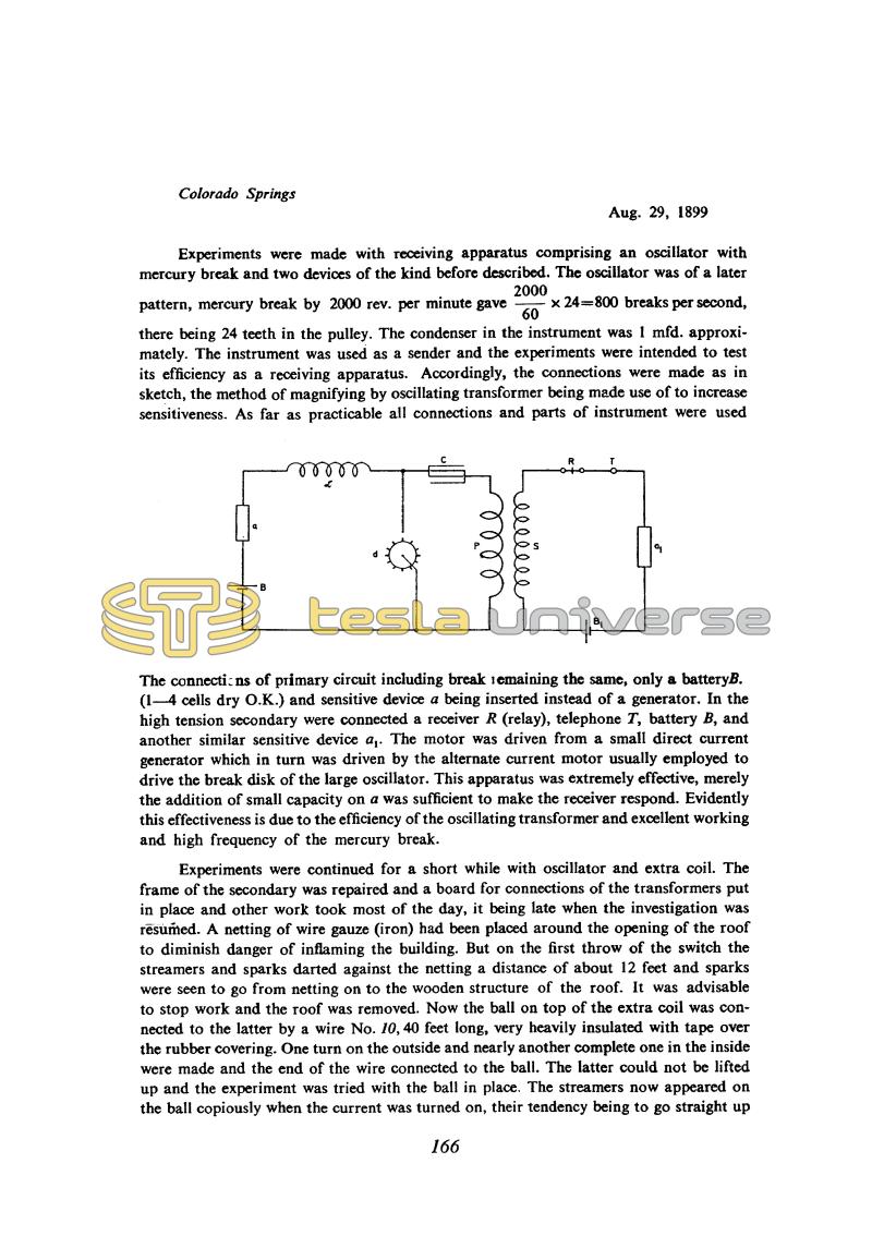 Tesla put the earphone T in the secondary circuit of the transformer, but in the text he doesn't say anything about it. The earphone sensitivity is normally much higher than the relay sensitivity and therefore it would be interesting to know something about Tesla's experience with this device. Unfortunately, there is no mention in his notes about an earphone.