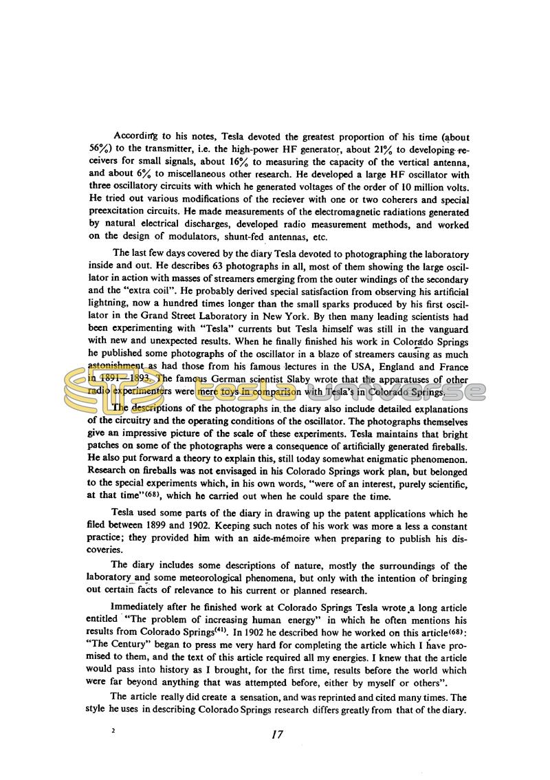 Immediately after he finished work at Colorado Springs Tesla wrote a long article entitled "The problem of increasing human energy" in which he often mentions his results from Colorado Springs(41). In 1902 he described how he worked on this article(68): "The Century" began to press me very hard for completing the article which I have promised to them, and the text of this article required all my energies. I knew that the article would pass into history as I brought, for the first time, results before the world which were far beyond anything that was attempted before, either by myself or others".