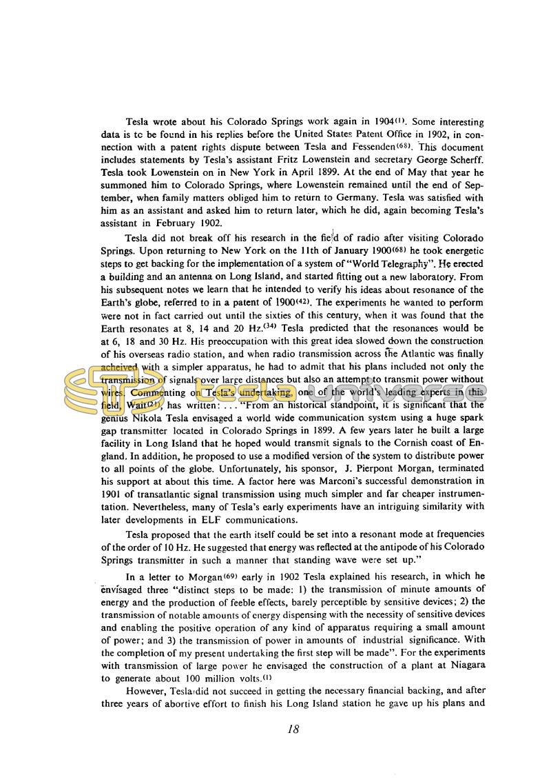 Tesla did not break off his research in the field of radio after visiting Colorado Springs. Upon returning to New York on the 11th of January 1900(68) he took energetic steps to get backing for the implementation of a system of "World Telegraphy". He erected a building and an antenna on Long Island, and started fitting out a new laboratory. From his subsequent notes we learn that he intended to verify his ideas about resonance of the Earth's globe, referred to in a patent of 1900(42). The experiments he wanted to perform were not in fact carried out until the sixties of this century, when it was found that the Earth resonates at 8, 14 and 20 Hz.(34) Tesla predicted that the resonances would be at 6, 18 and 30 Hz. His preoccupation with this great idea slowed down the construction of his overseas radio station, and when radio transmission across the Atlantic was finally acheived with a simpler apparatus, he had to admit that his plans included not only the transmission of signals over large distances but also an attempt to transmit power without wires. Commenting on Tesla's undertaking, one of the world's leading experts in this field, Wait(21), has written: ... "From an historical standpoint, it is significant that the genius Nikola Tesla envisaged a world wide communication system using a huge spark gap transmitter located in Colorado Springs in 1899. A few years later he built a large facility in Long Island that he hoped would transmit signals to the Cornish coast of England. In addition, he proposed to use a modified version of the system to distribute power to all points of the globe. Unfortunately, his sponsor, J. Pierpont Morgan, terminated his support at about this time. A factor here was Marconi's successful demonstration in 1901 of transatlantic signal transmission using much simpler and far cheaper instrumentation. Nevertheless, many of Tesla's early experiments have an intriguing similarity with later developments in ELF communications.