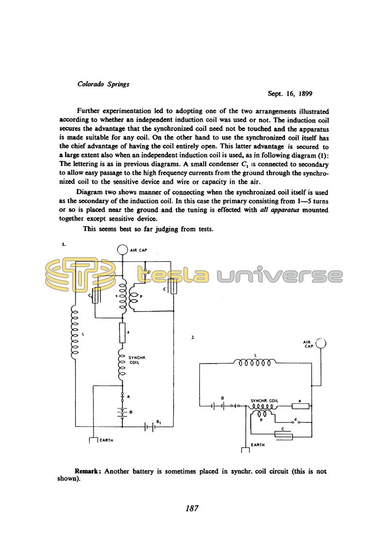 Further experimentation led to adopting one of the two arrangements illustrated according to whether an independent induction coil was used or not. The induction coil secures the advantage that the synchronized coil need not be touched and the apparatus is made suitable for any coil. On the other hand to use the synchronized coil itself has the chief advantage of having the coil entirely open. This latter advantage is secured to a large extent also when an independent induction coil is used, as in following diagram (1): The lettering is as in previous diagrams. A small condenser C1 is connected to secondary to allow easy passage to the high frequency currents from the ground through the synchronized coil to the sensitive device and wire or capacity in the air.