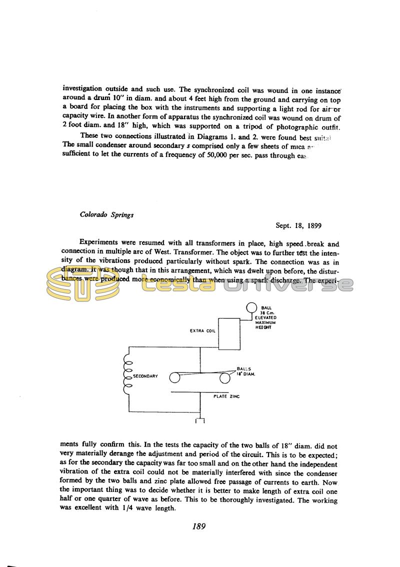 In the tests the capacity of the two balls of 18" diam. did not very materially derange the adjustment and period of the circuit. This is to be expected; as for the secondary the capacity was far too small and on the other hand the independent vibration of the extra coil could not be materially interfered with since the condenser formed by the two balls and zinc plate allowed free passage of currents to earth. Now the important thing was to decide whether it is better to make length of extra coil one half or one quarter of wave as before. This to be thoroughly investigated. The working was excellent with 1/4 wave length.