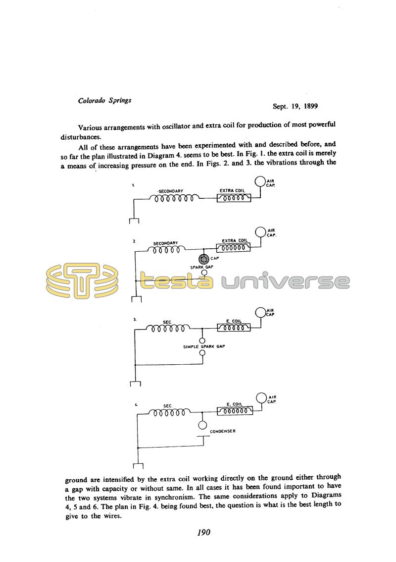 All of these arrangements have been experimented with and described before, and so far the plan illustrated in Diagram 4. seems to be best. In Fig. 1. the extra coil is merely a means of increasing pressure on the end. In Figs. 2. and 3. the vibrations through the ground are intensified by the extra coil working directly on the ground either through a gap with capacity or without same.