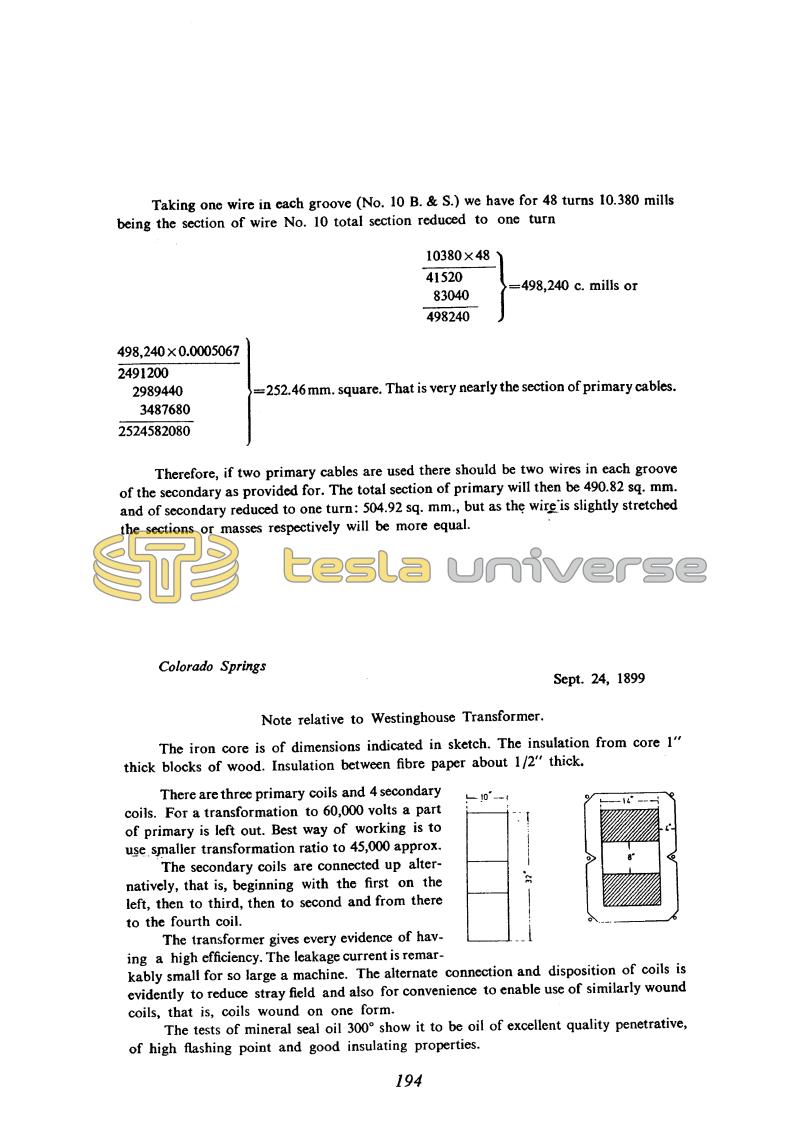 Therefore, if two primary cables are used there should be two wires in each groove of the secondary as provided for. The total section of primary will then be 490.82 sq. mm. and of secondary reduced to one turn: 504.92 sq. mm., but as the wire is slightly stretched the sections or masses respectively will be more equal.