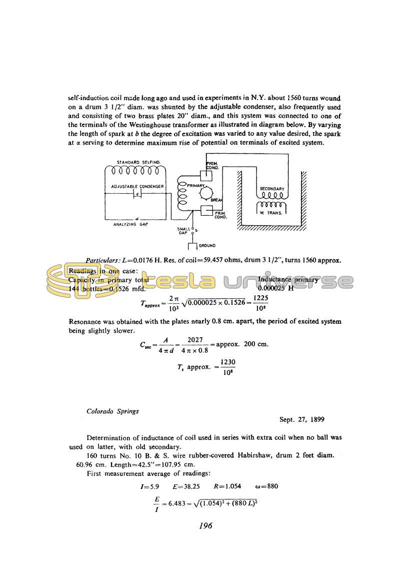 He measures the auxiliary coil inductance by the same method he applied on Sept. 25, except now he takes into account the coil resistance as well (measured probably by DC current so that skirt effect was not taken into account). By following the principle that measured values have to be proven by calculation, he calculates the inductances of the same coil by means of the equation for a long coil and he does not get the expected results. In a short review of not expected results he mentioned the possibility that the distributed coil capacitance influenced the measured value. But this is difficult to believe because the distributed capacitances increase the effective inductance in frequency range below the coil self resonant frequency. Another possibility remains which Tesla mentions (the non-accuracy of coil dimensions) and low accuracy of the theoretical equation which is approximate and the ratio of the coil's length to its diameter which is very high.