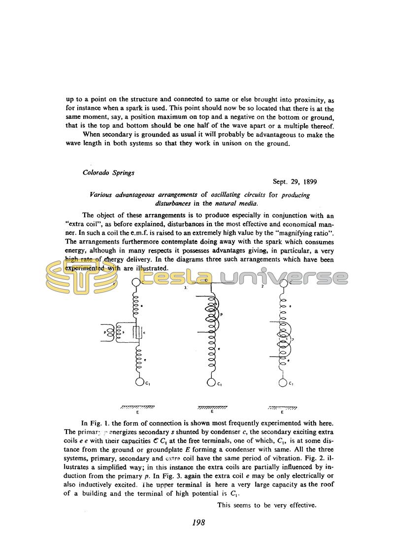 In Fig. 1. the form of connection is shown most frequently experimented with here. The primary energizes secondary s shunted by condenser c, the secondary exciting extra coils e e with their capacities C C1 at the free terminals, one of which, C1, is at some distance from the ground or groundplate E forming a condenser with same. All the three systems, primary, secondary and extra coil have the same period of vibration. Fig. 2. illustrates a simplified way; in this instance the extra coils are partially influenced by induction from the primary p. In Fig. 3. again the extra coil e may be only electrically or also inductively excited. The upper terminal is here a very large capacity as the roof of a building and the terminal of high potential is C1.